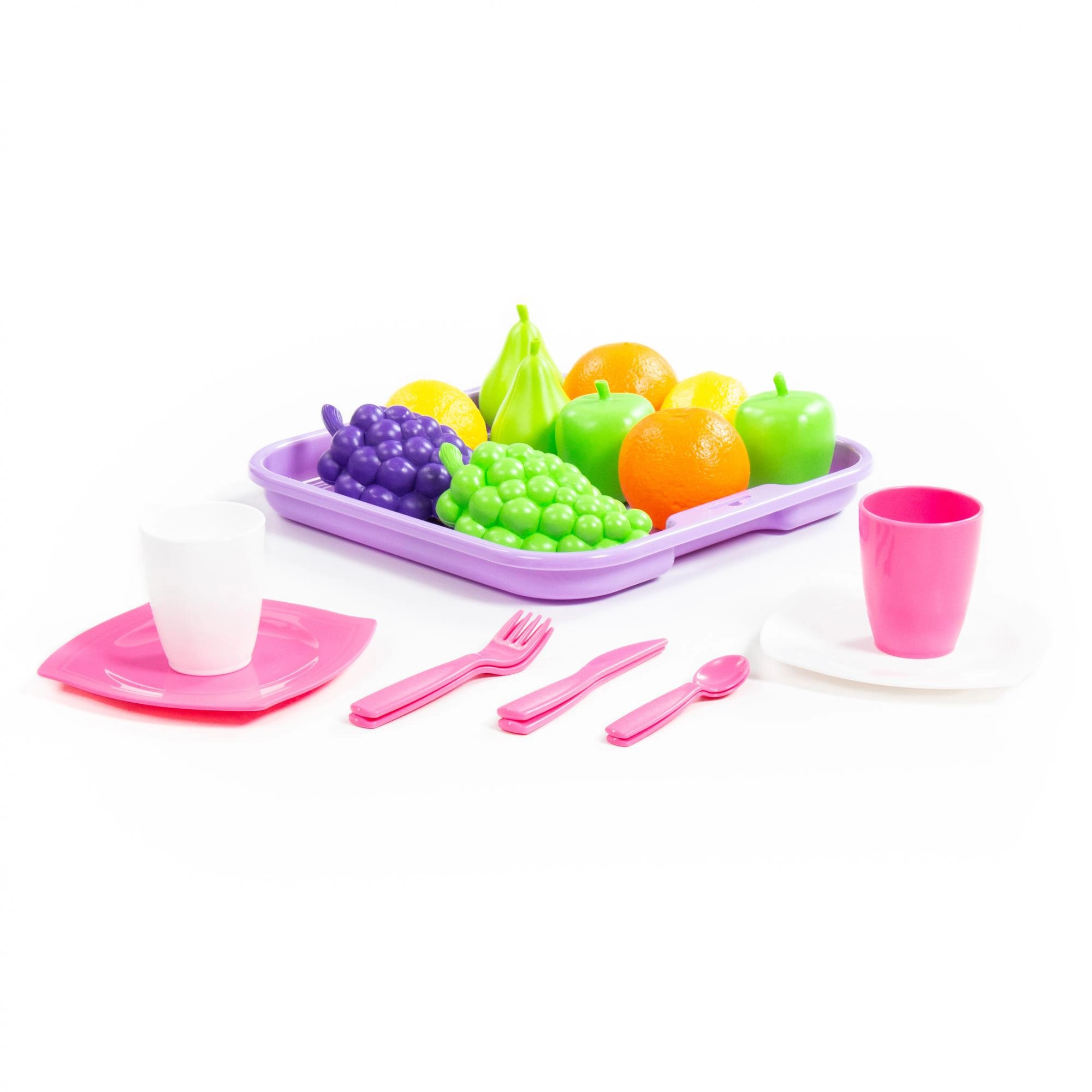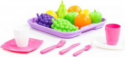 - Fruits en plastique, assiettes, gobelets, couverts, plateau