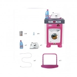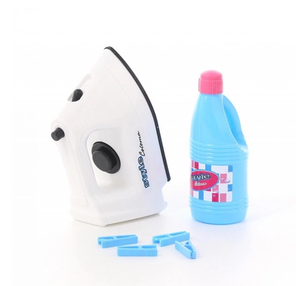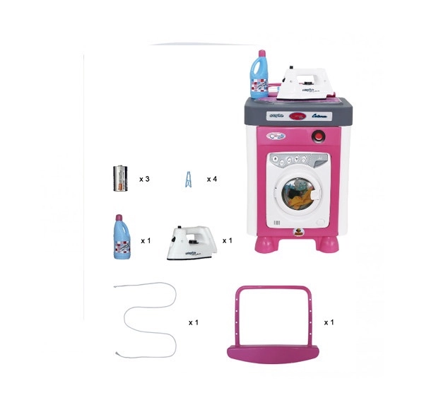 L’emballage comprend un équipement complet pour les petits aides: panneau de jeu/planche à repasser avec surface textile pour un « repassage » sûr, fer à repasser pour enfants, portemanteau/étendoir à linge avec corde et 4 pinces. Grâce aux piles incluses, on peut jouer immédiatement après le déballage.