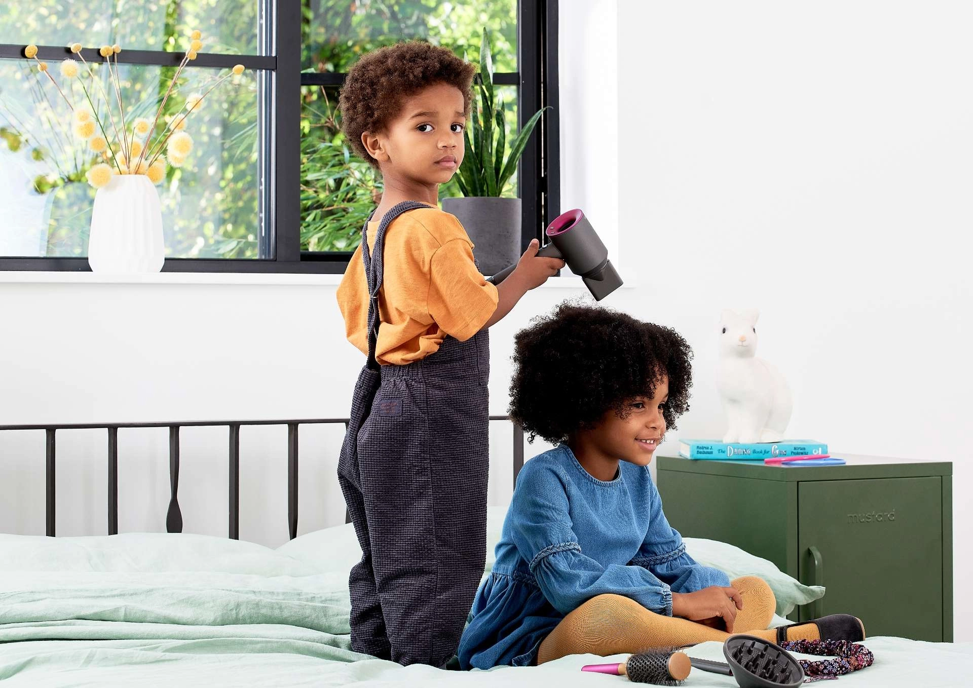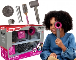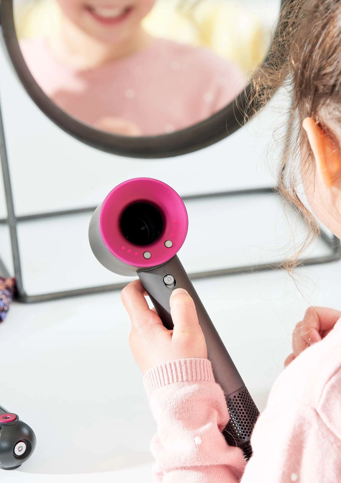 Le set de coiffure pour enfants CASDON avec l’iconique Dyson Supersonic offre aux enfants une expérience de salon authentique. Le jouet souffle de l’air, dispose d’effets lumineux et grâce aux embouts magnétiques/interchangeables, il permet de varier le style de séchage. La brosse ronde et le peigne large inclus stimulent l’imagination pour créer des coiffures pour enfants, poupées et amis.