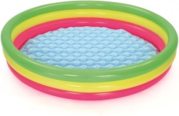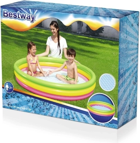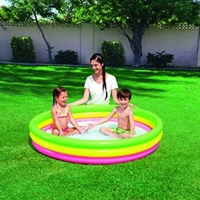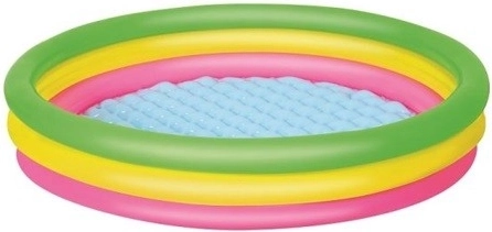 Cette piscine ronde aux couleurs arc-en-ciel, en vinyle résistant, offre confort et sécurité pour les jeux d’eau des enfants. Son fond souple, gonflable et texturé amortit les pas et isole du froid du sol, ce qui la rend parfaite aussi bien sur la pelouse que sur la terrasse. Trois anneaux gonflés séparément maintiennent la forme et renforcent la stabilité de la structure.