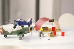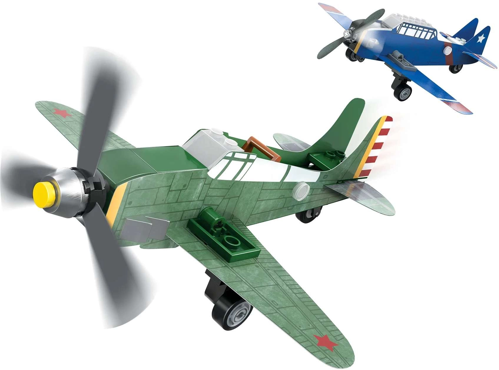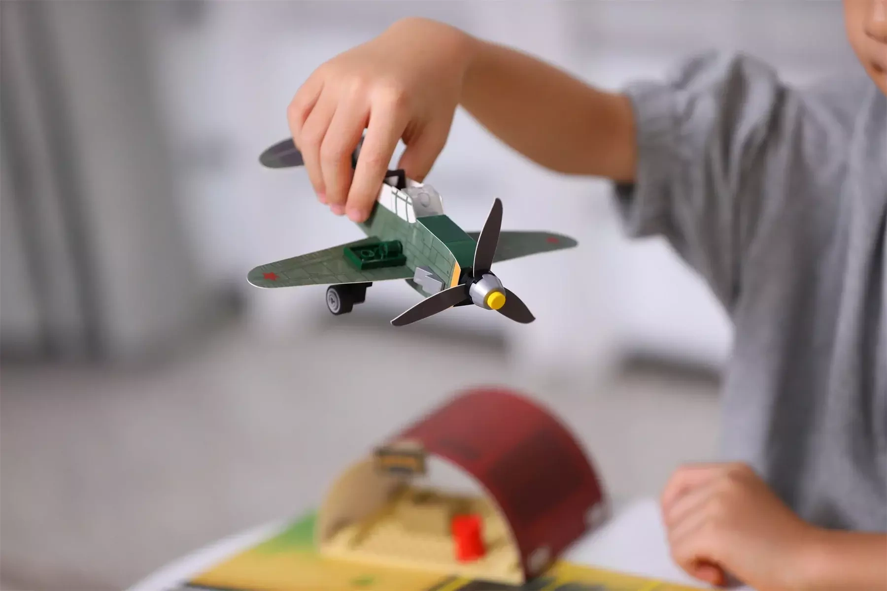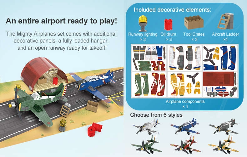 - briques, 8× brique à clips, 20× composants d’avions en papier, 2× éclairage de piste d’atterrissage, 3× fût d’huile, 2× caisse à outils, échelle d’accès à l’avion, notice