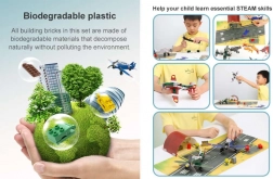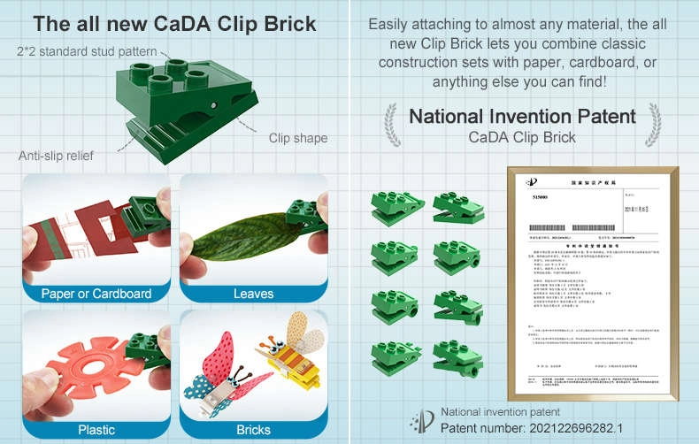 Le coffret comprend des briques à clips qui se fixent au papier ou au tissu, permettant aux enfants de créer au-delà des pièces standard. La boîte sert de piste ou de support pour exposer les modèles terminés. Les pièces sont compatibles avec d’autres sets CADA.