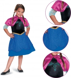 Le set comprend une robe dans des tons bleus et noir satiné et une courte cape rose, pour un look fidèle au personnage d’Anna. Le costume est destiné aux enfants de 5–6 ans et convient aux enfants mesurant 109–123 cm.