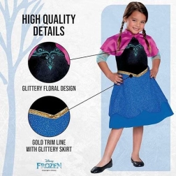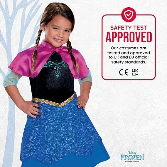 Adorable déguisement pour enfants Disney La Reine des Neiges Anna pour les filles mesurant 109–123 cm. Robe légère et confortable dans des tons de bleu et de noir satiné, complétée par une courte cape rose. Idéale pour le carnaval, les bals masqués et le jeu à la maison ou en extérieur. Produit sous licence officielle DISNEY de la marque Disguise.