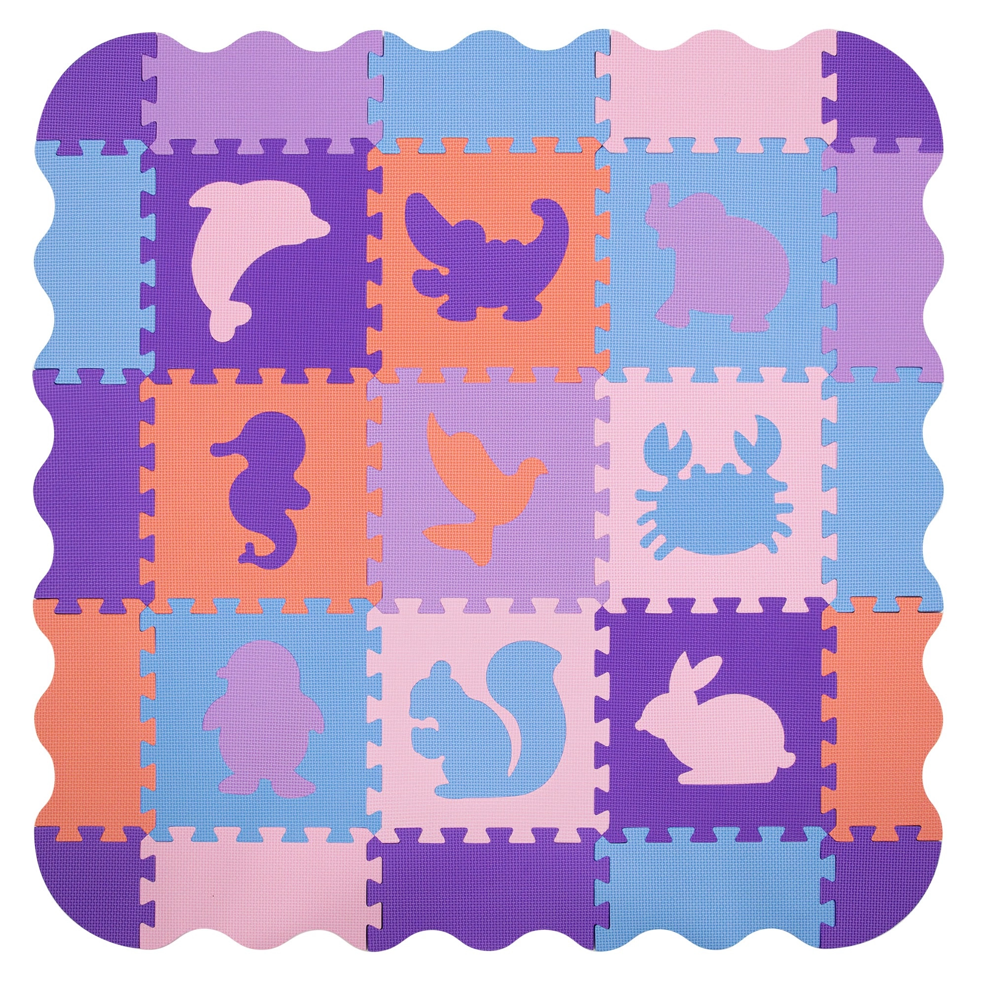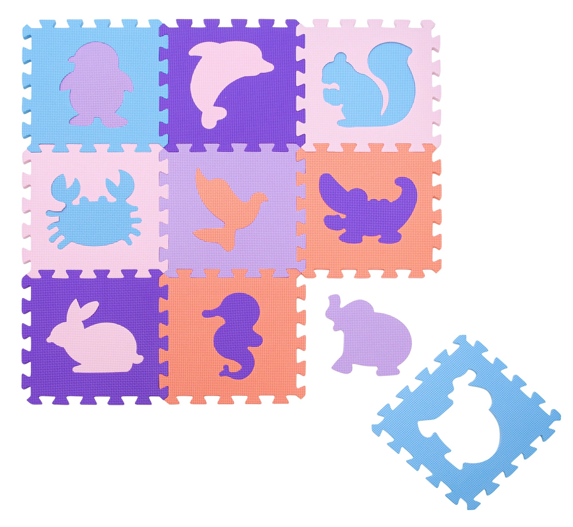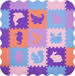 Le matériau sûr en EVA est souple, absorbe les chocs et isole très bien du froid du sol. La surface texturée est antidérapante, idéale pour les premiers rampements et pas. Chaque pièce possède un motif animal amovible (pingouin, dauphin, écureuil, crabe, colombe, crocodile, lapin, hippocampe, éléphant), permettant aux enfants d’exercer leur motricité fine et leur logique.