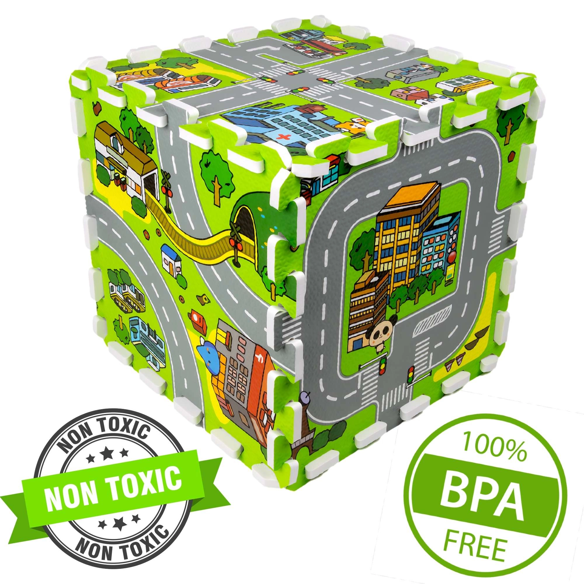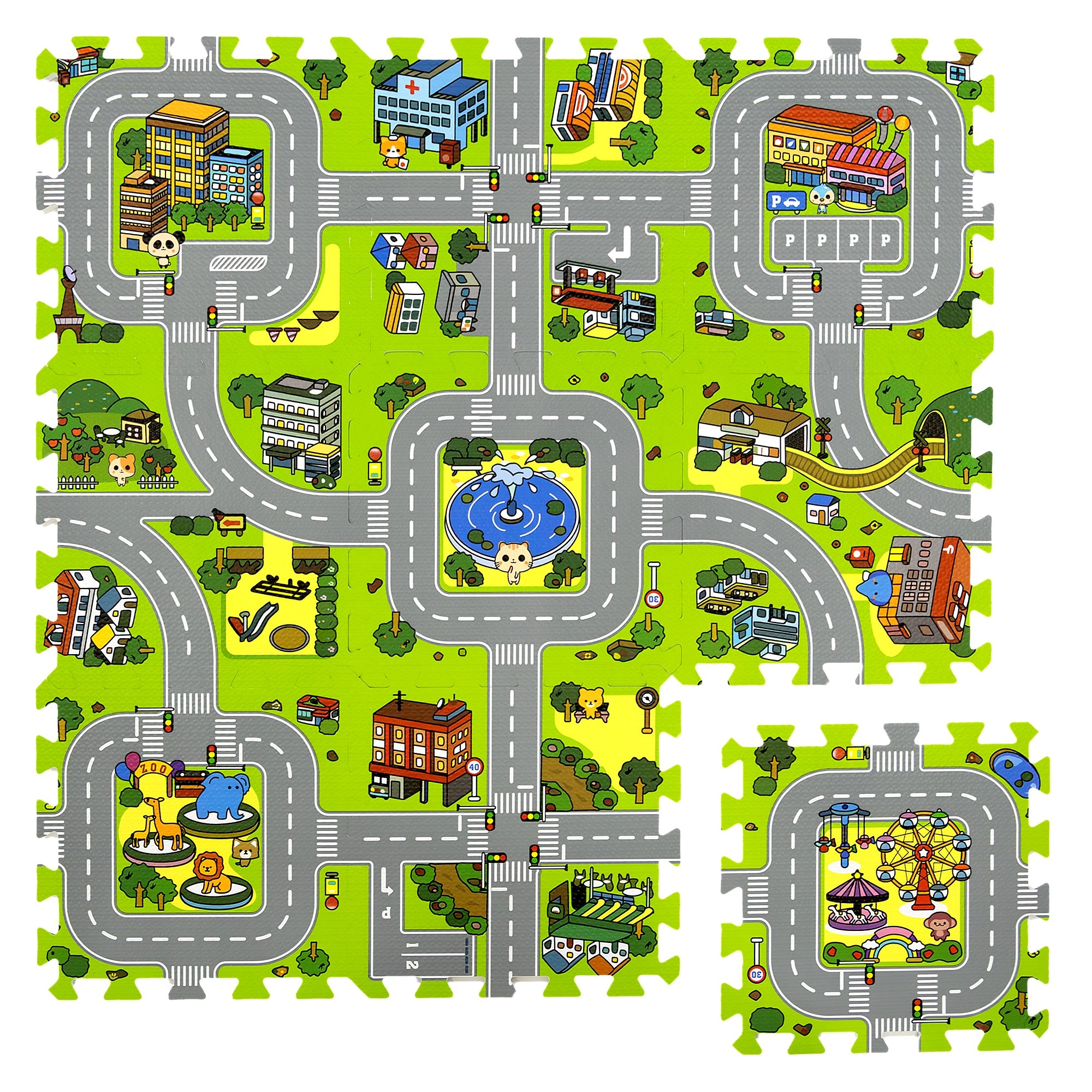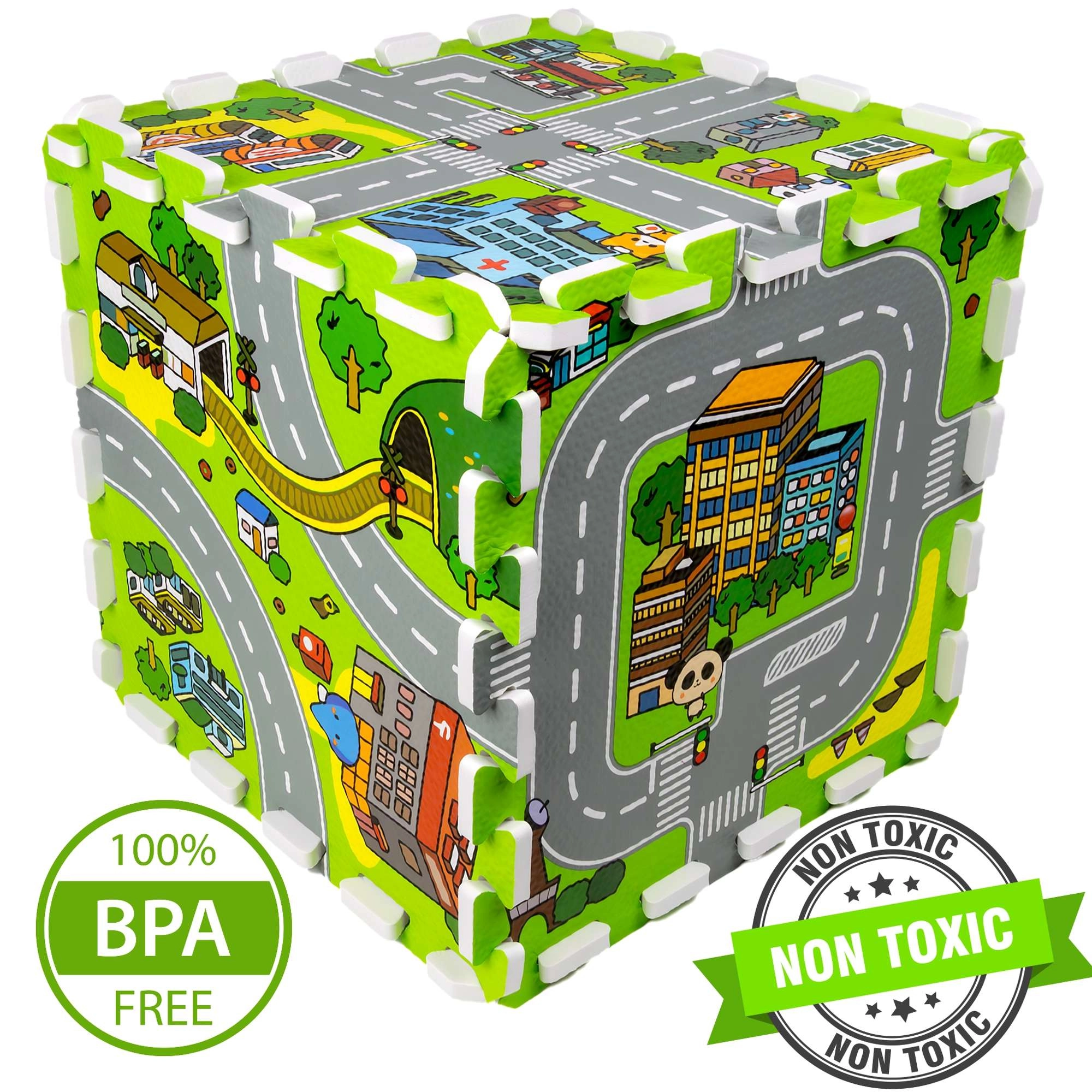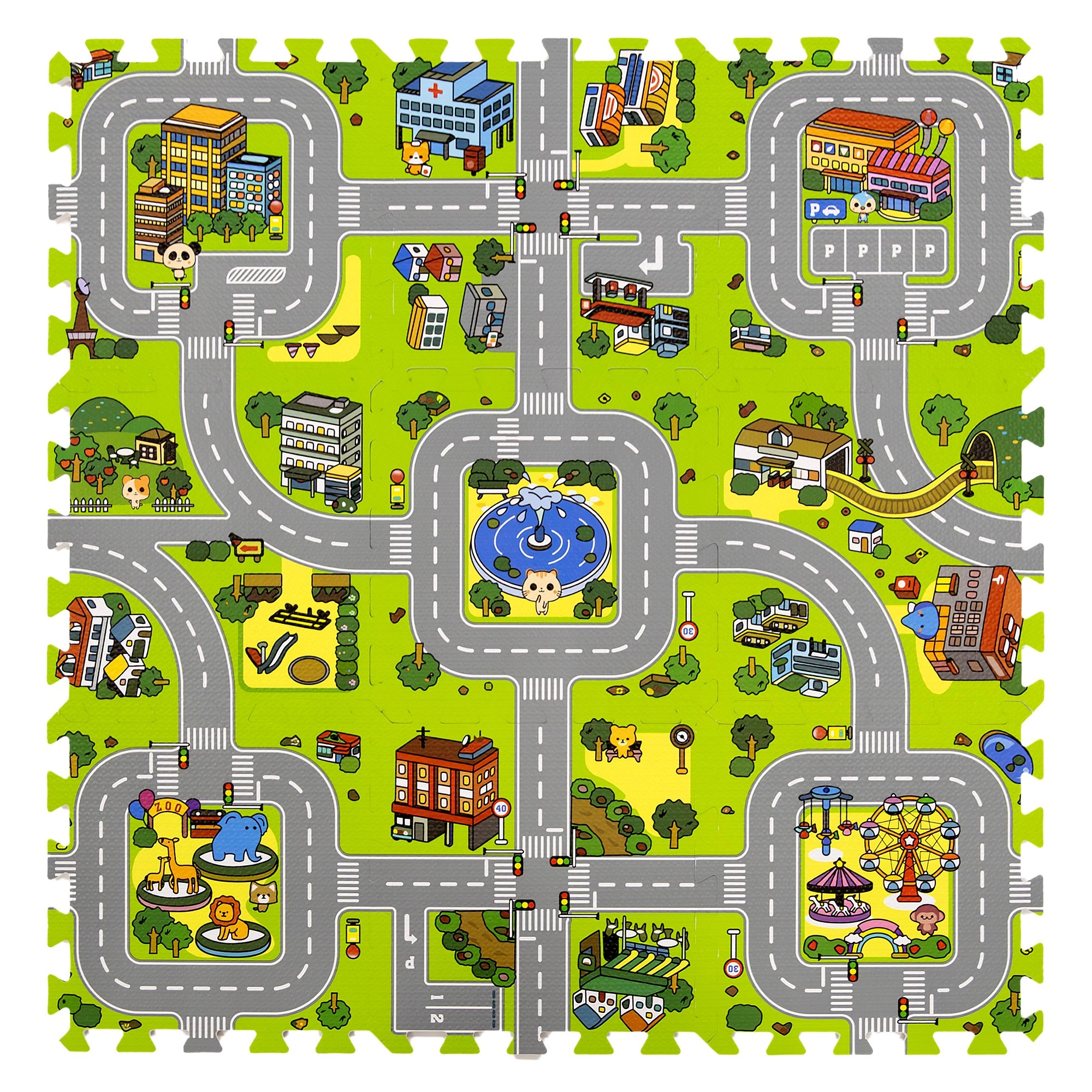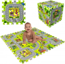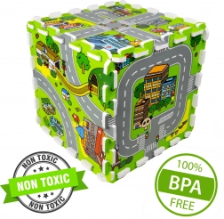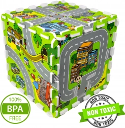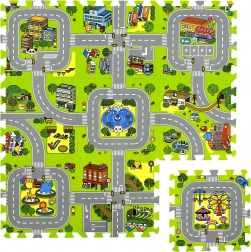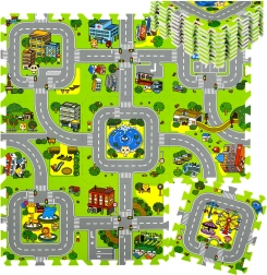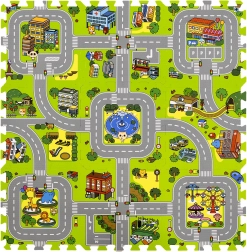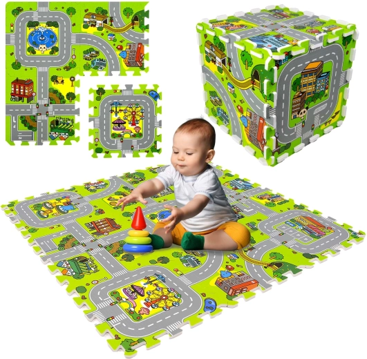 Ce tapis en mousse pour enfants de haute qualité au motif de ville crée une surface douce et sûre pour les bébés comme pour les plus grands. Chaque pièce représente une partie différente de la petite ville – routes, parc, zoo, hôpital, station-service et plus encore – ce qui en fait une excellente scène de jeu pour les petites voitures et figurines. Grâce à son épaisseur de 1 cm, le tapis amortit les chutes, protège du froid et est facile à entretenir.