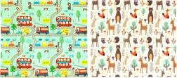 Deux visuels éducatifs stimulent l’imagination et l’apprentissage : adorables animaux de la forêt et petites rues colorées sur fond turquoise.