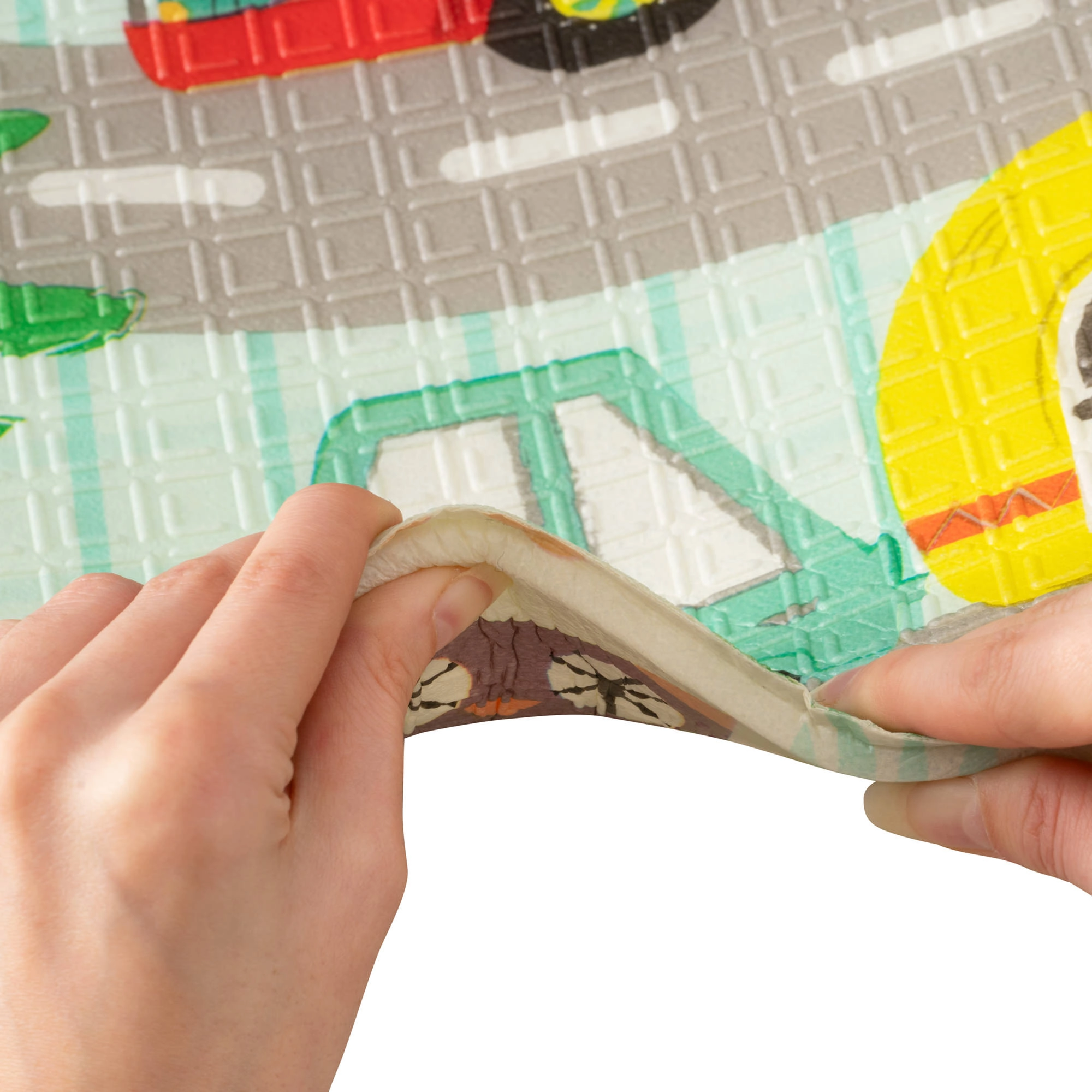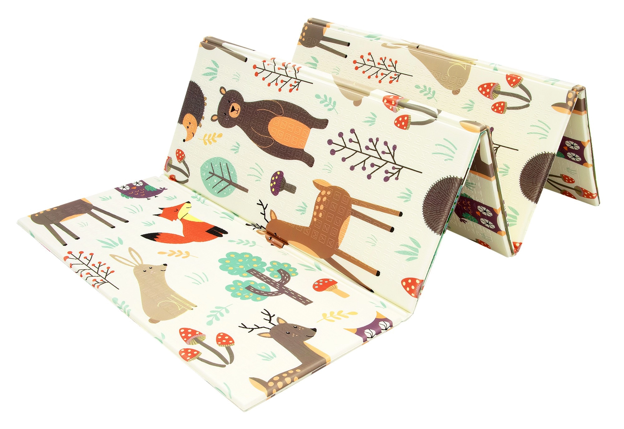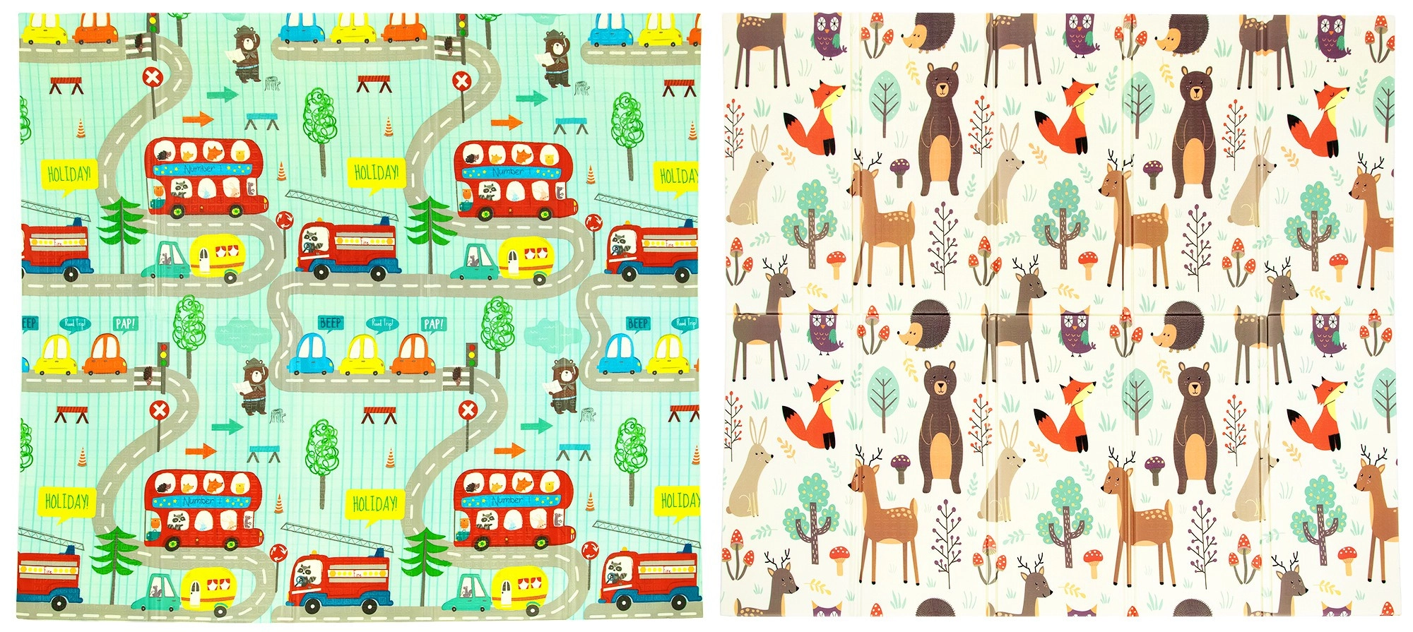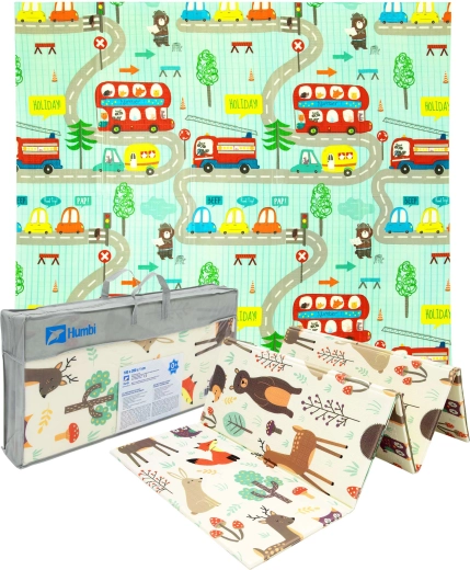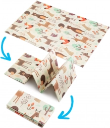 Le tapis est réversible : une face avec de délicats motifs d’animaux de la forêt, l’autre avec de petites rues colorées. Il se plie facilement en un format compact, est léger et, grâce au sac zippé avec poignées, vous l’emportez au salon, dans la chambre d’enfant, au jardin ou en pique-nique. La surface imperméable se nettoie d’un simple coup de chiffon humide – une solution hygiénique adaptée aussi aux personnes allergiques.