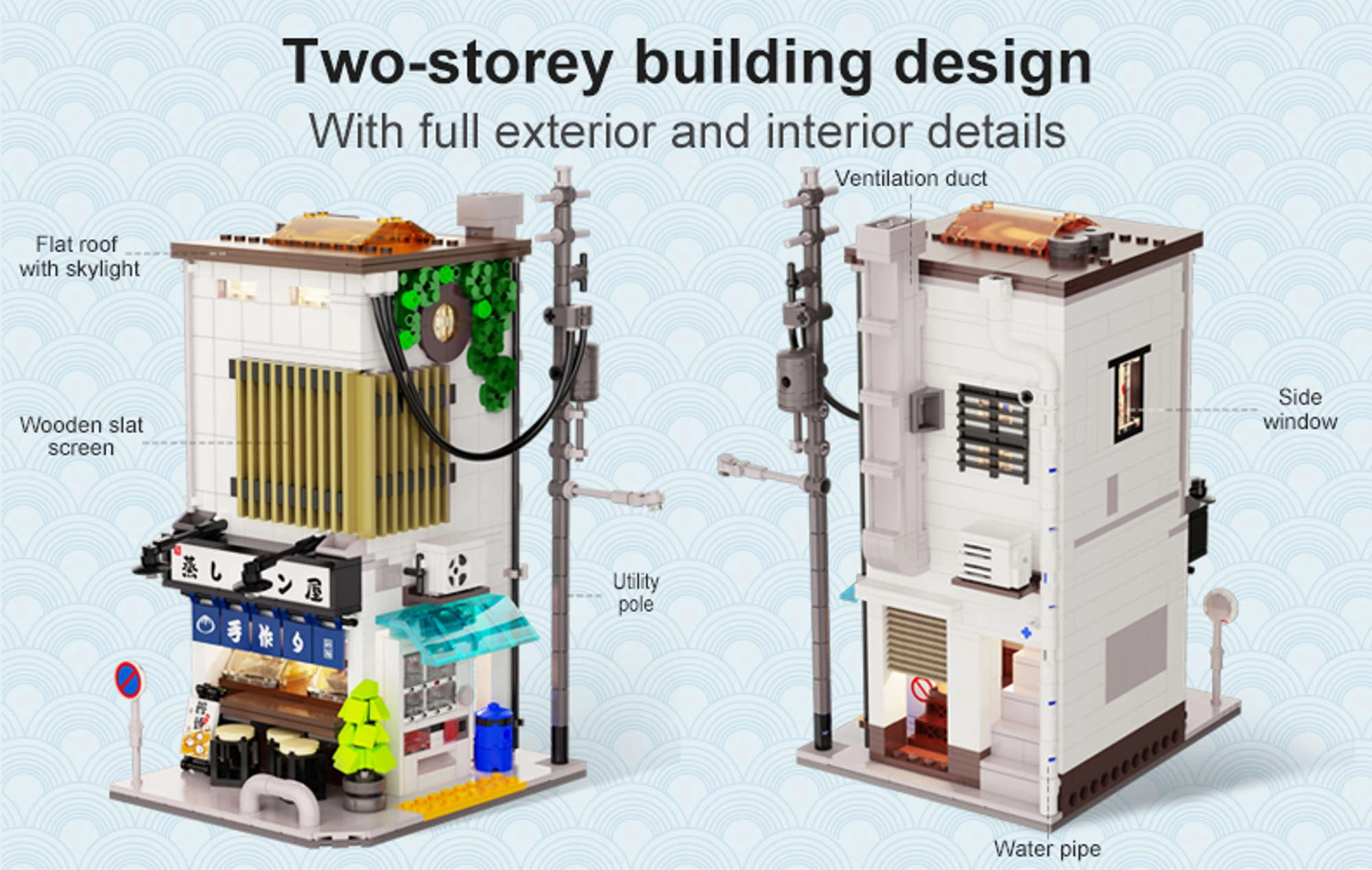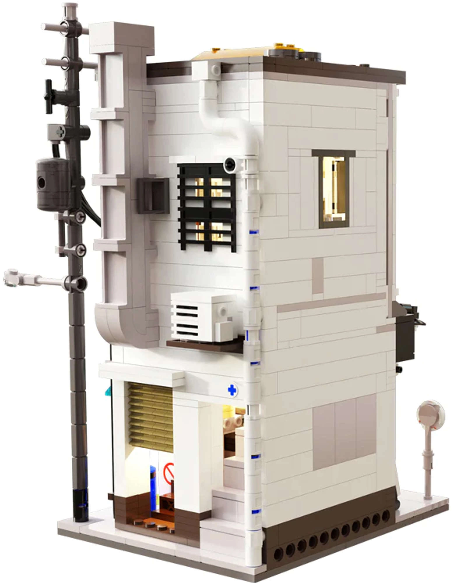 Un poteau électrique, une gaine de ventilation, une gouttière, une climatisation, une enseigne et un distributeur de boissons confèrent au modèle un aspect authentique.