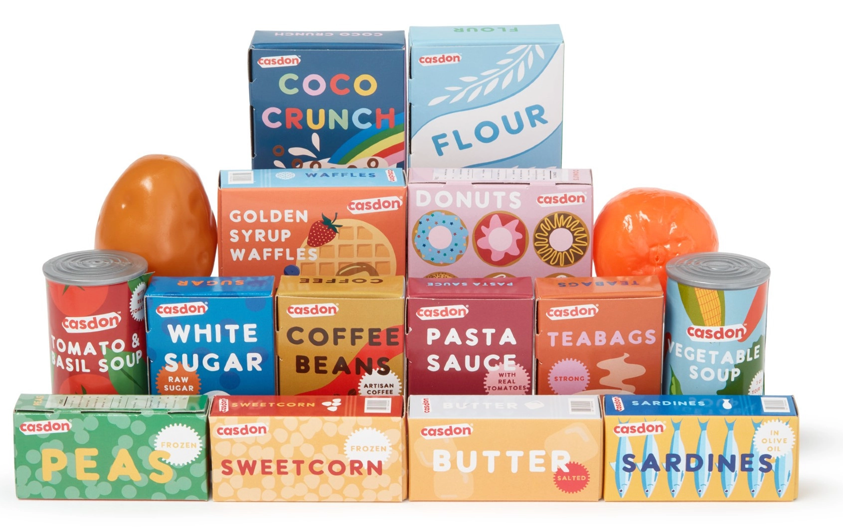 Comprend 16 pièces d’aliments factices : boîtes et conserves imprimées (farine, thé, café, petits pois, sucre, etc.) et fruits/légumes en plastique.