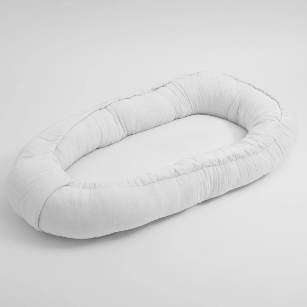 Le doux cocon en mousseline New Baby de couleur blanche offre à votre bébé un espace sûr et confortable à la maison comme en voyage. Grâce à ses bords moelleux et à son tissu respirant en coton, votre enfant se sent apaisé et en sécurité, ce qui lui permet de mieux dormir, se reposer et jouer. Parfait pour le lit bébé, le canapé, le sol ou la poussette.