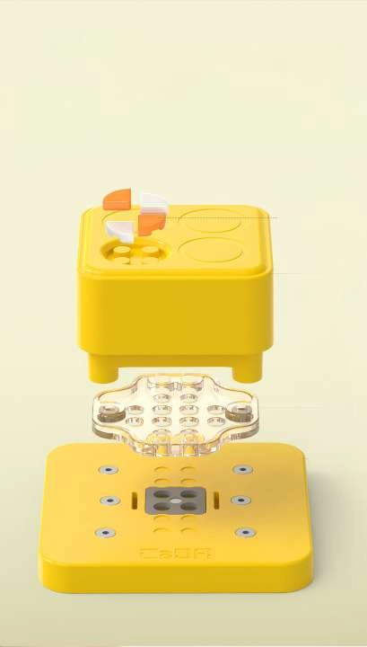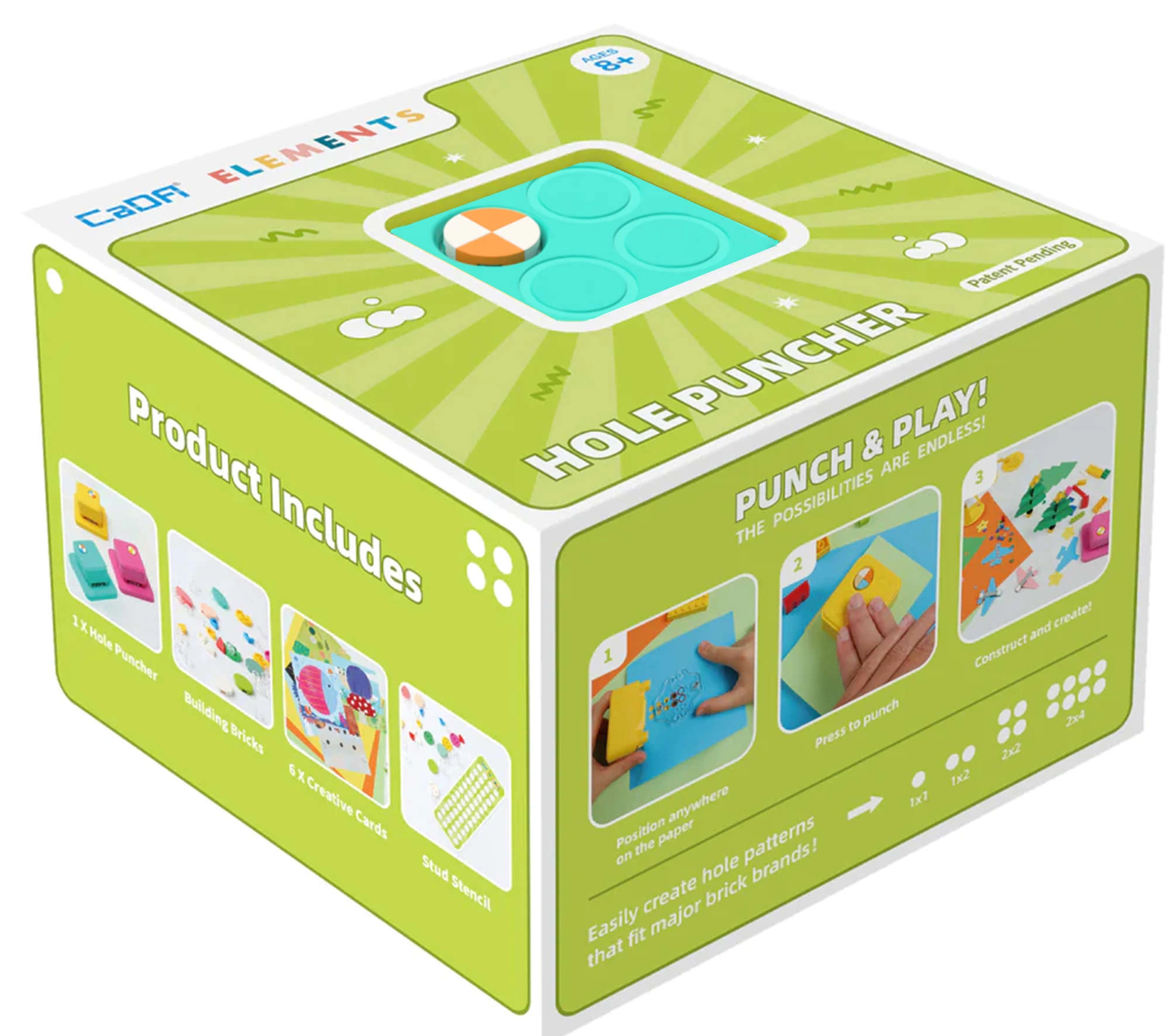 La boîte contient tout pour créer immédiatement : perforateur avec plaque, 99 briques, 2 gabarits perforés et 6 cartes décoratives. Le kit est compatible avec d’autres sets CADA, ce qui permet de l’agrandir facilement et de pousser la créativité encore plus loin.