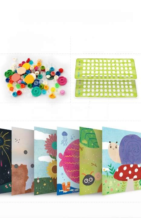 Les enfants commencent par perforer les gabarits et les cartes, puis les remplissent avec des pièces colorées. Ils créent ainsi des mosaïques ludiques et des décorations qui stimulent l’imagination.