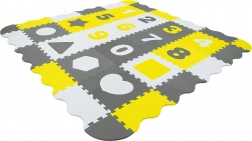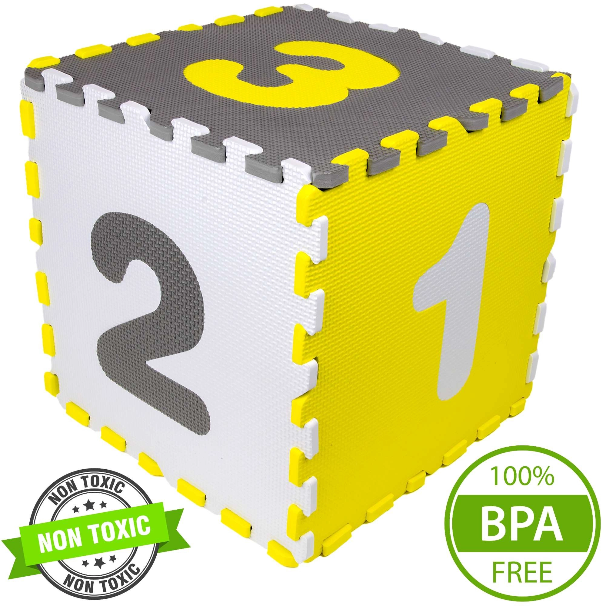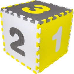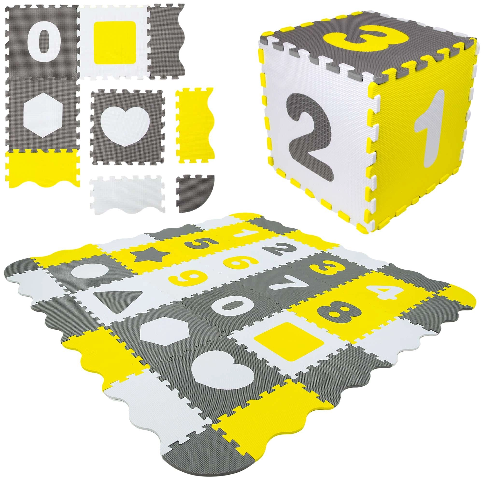 Tapis pratique et sûr pour bébés et enfants 3-en-1 : tapis de jeu doux, parc XXL et puzzle 3D en mousse. Ensemble en mousse EVA élastique de 150 × 150 × 1 cm, antidérapant, imperméable et facile à nettoyer. Contient des éléments amovibles avec chiffres 0–9 et formes géométriques pour l’apprentissage et le développement de la motricité. Sans phtalates, formamide, BPA ni PVC, conforme aux normes EN 71 et REACH, avec marquage CE.