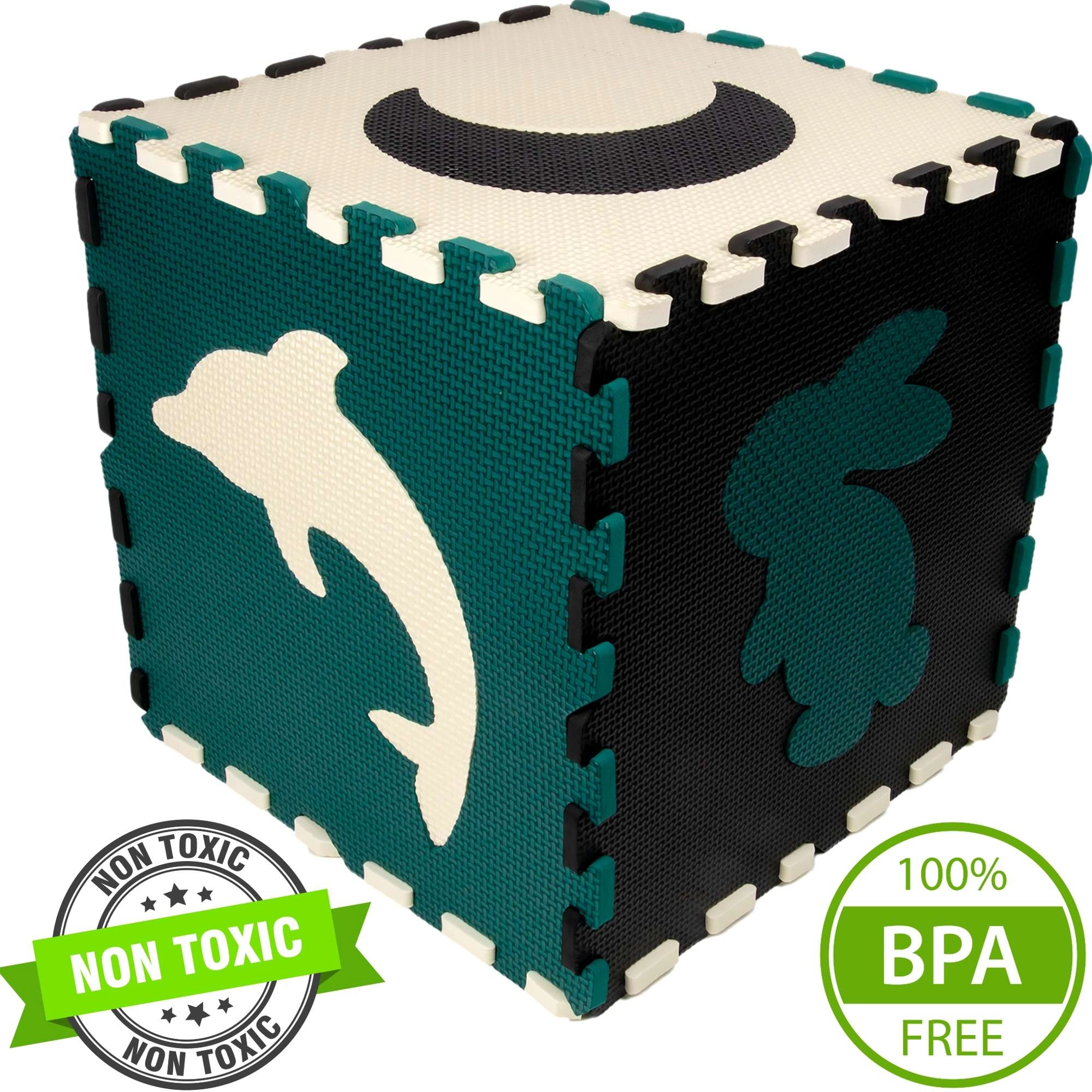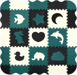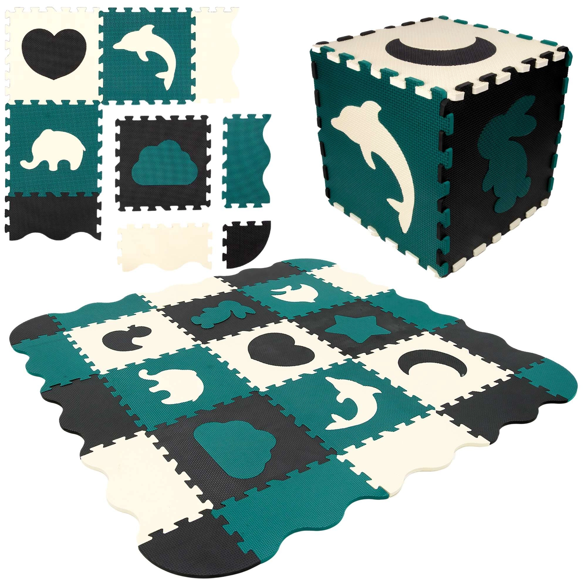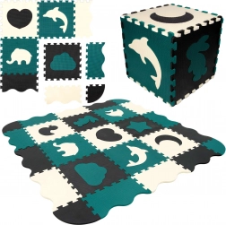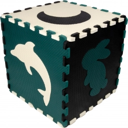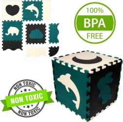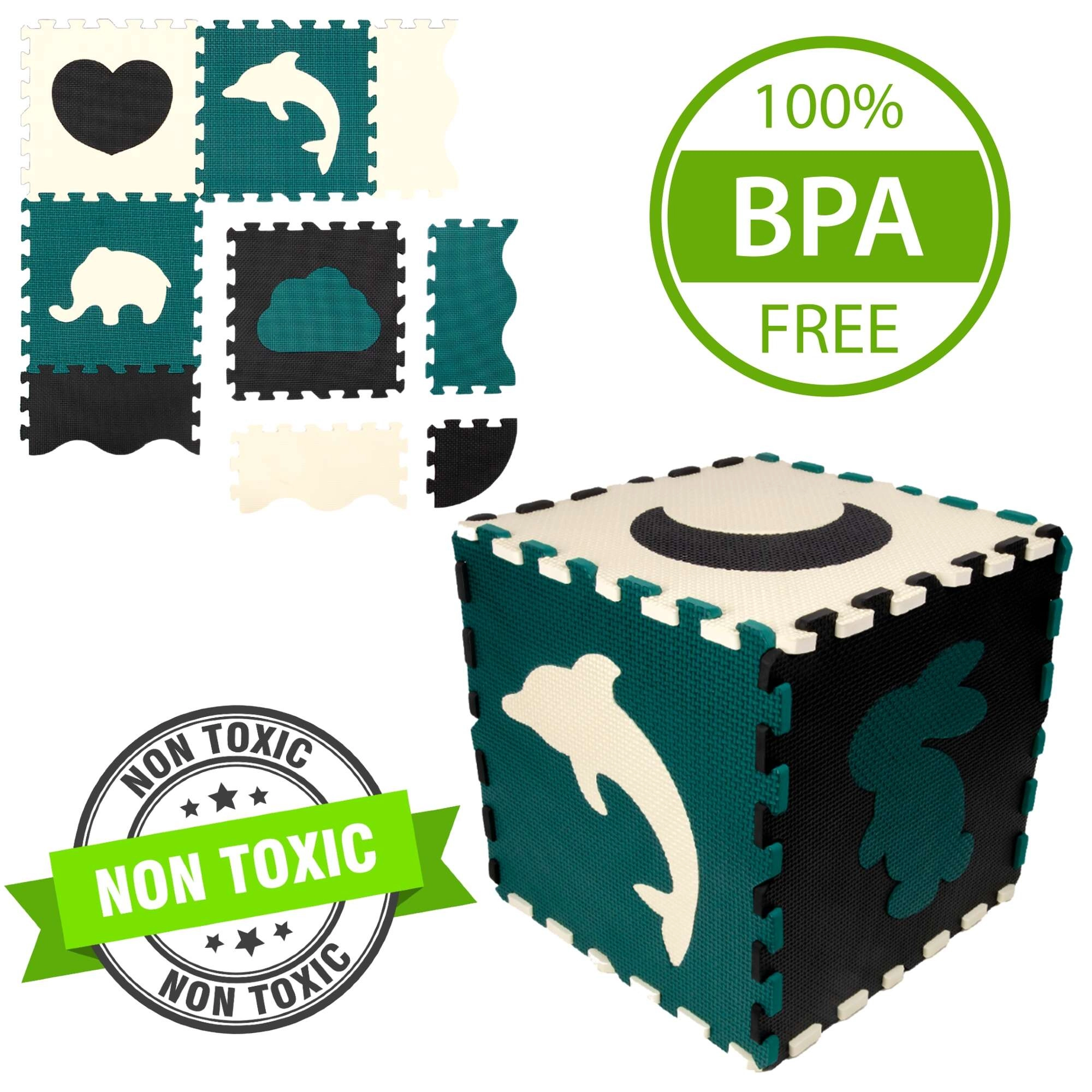 Les pièces servent aussi de puzzle 3D – les motifs d’animaux et de formes amovibles peuvent être assemblés pour créer des objets en volume (p. ex. un cube), ce qui développe chez l’enfant la représentation spatiale, la prééhension et la coordination. Le matériau EVA est sans phtalates, formamide, BPA et PVC, conforme aux normes EN 71 et REACH et porte le marquage CE.