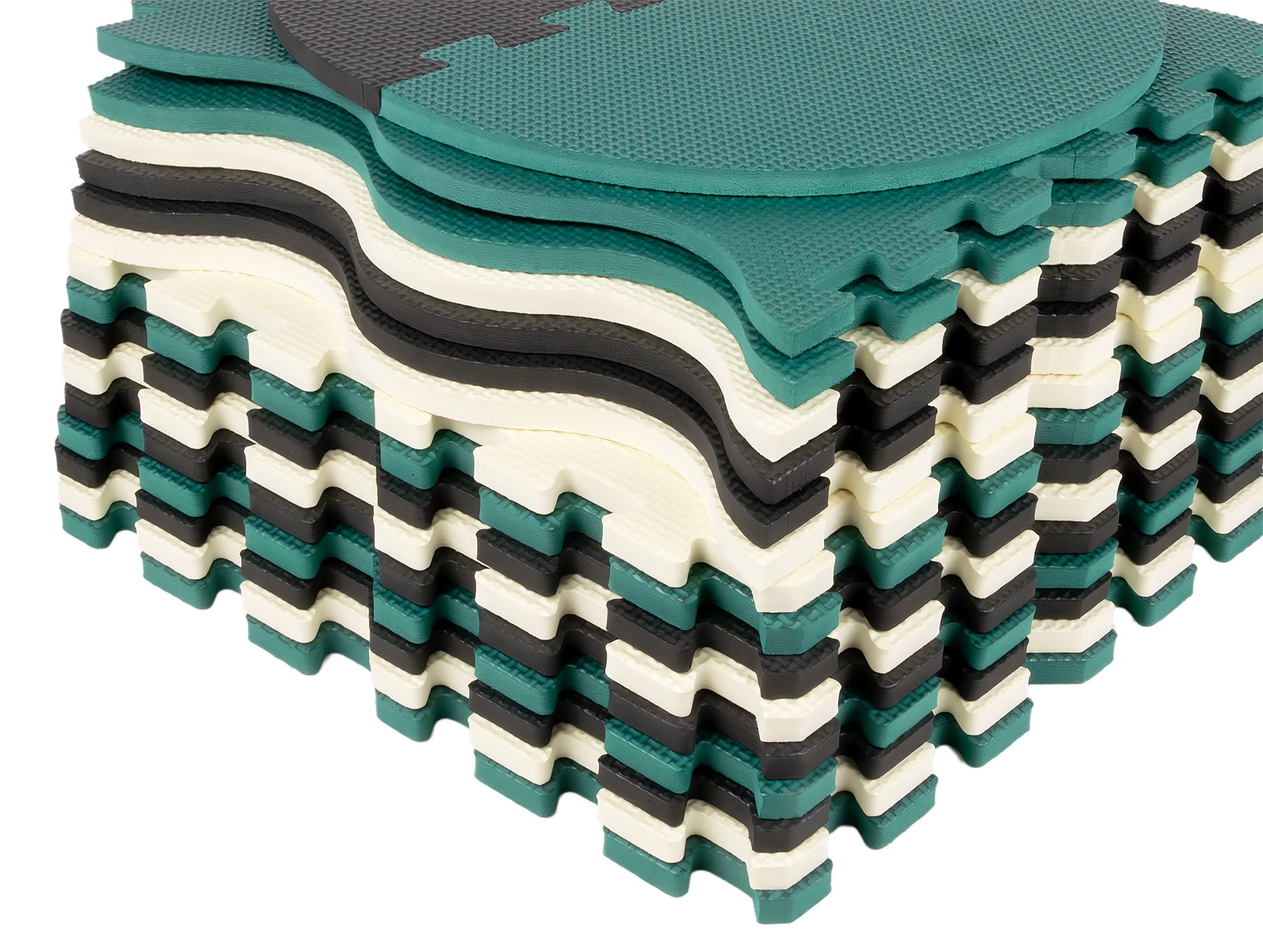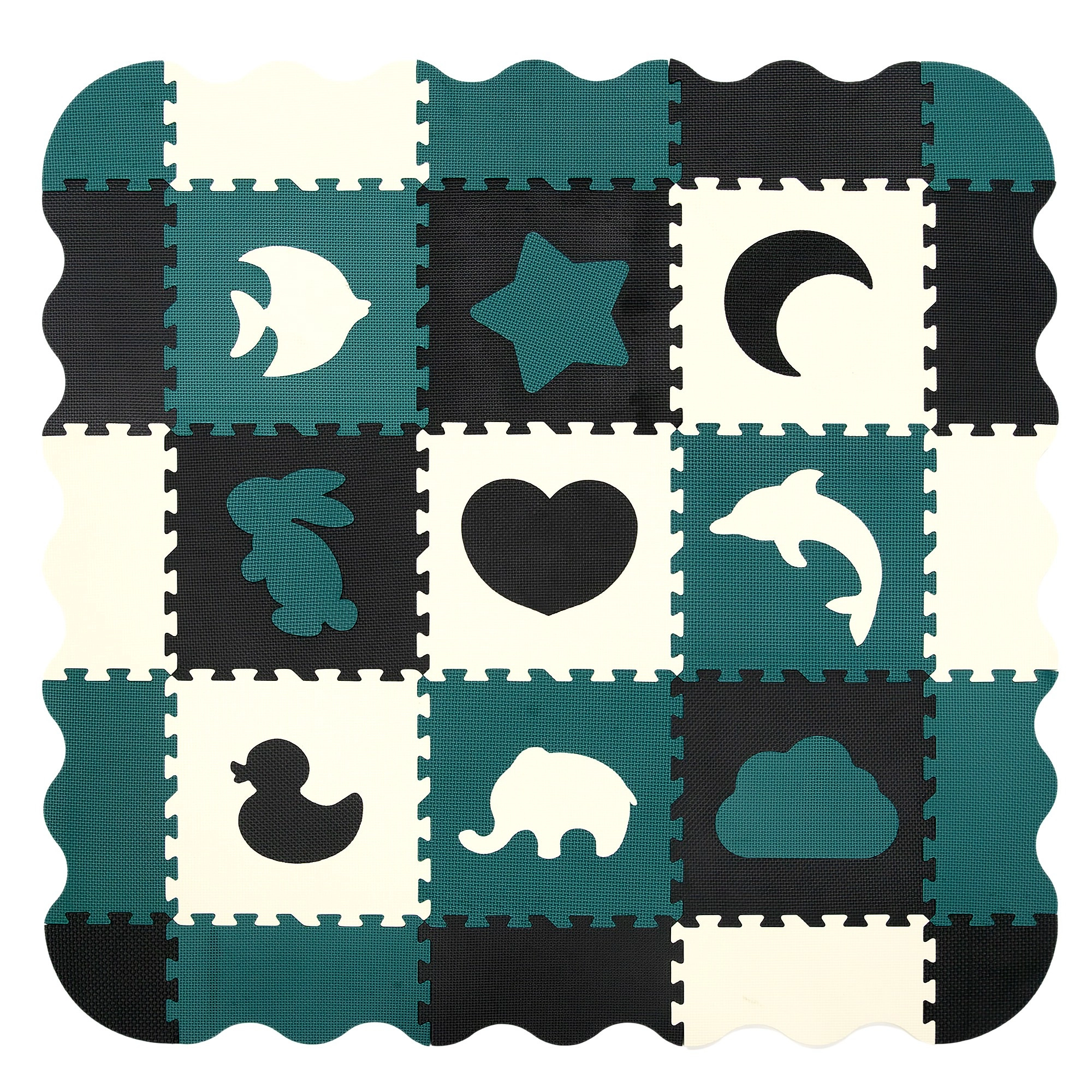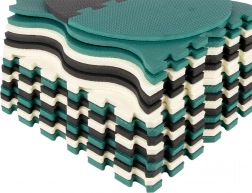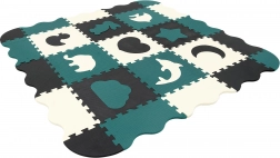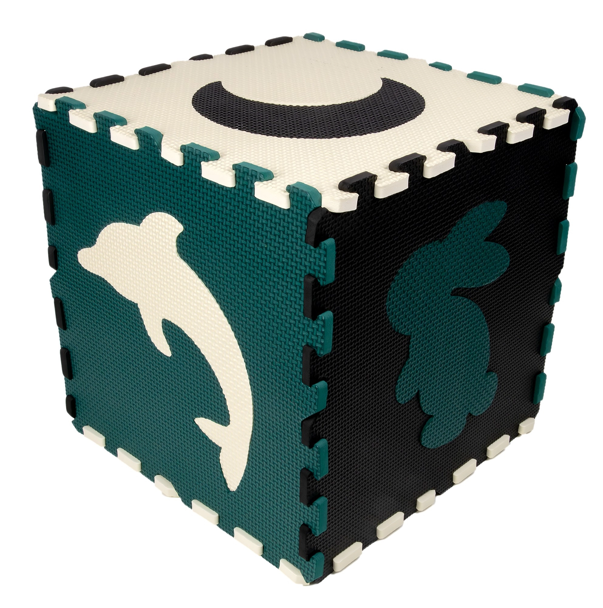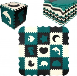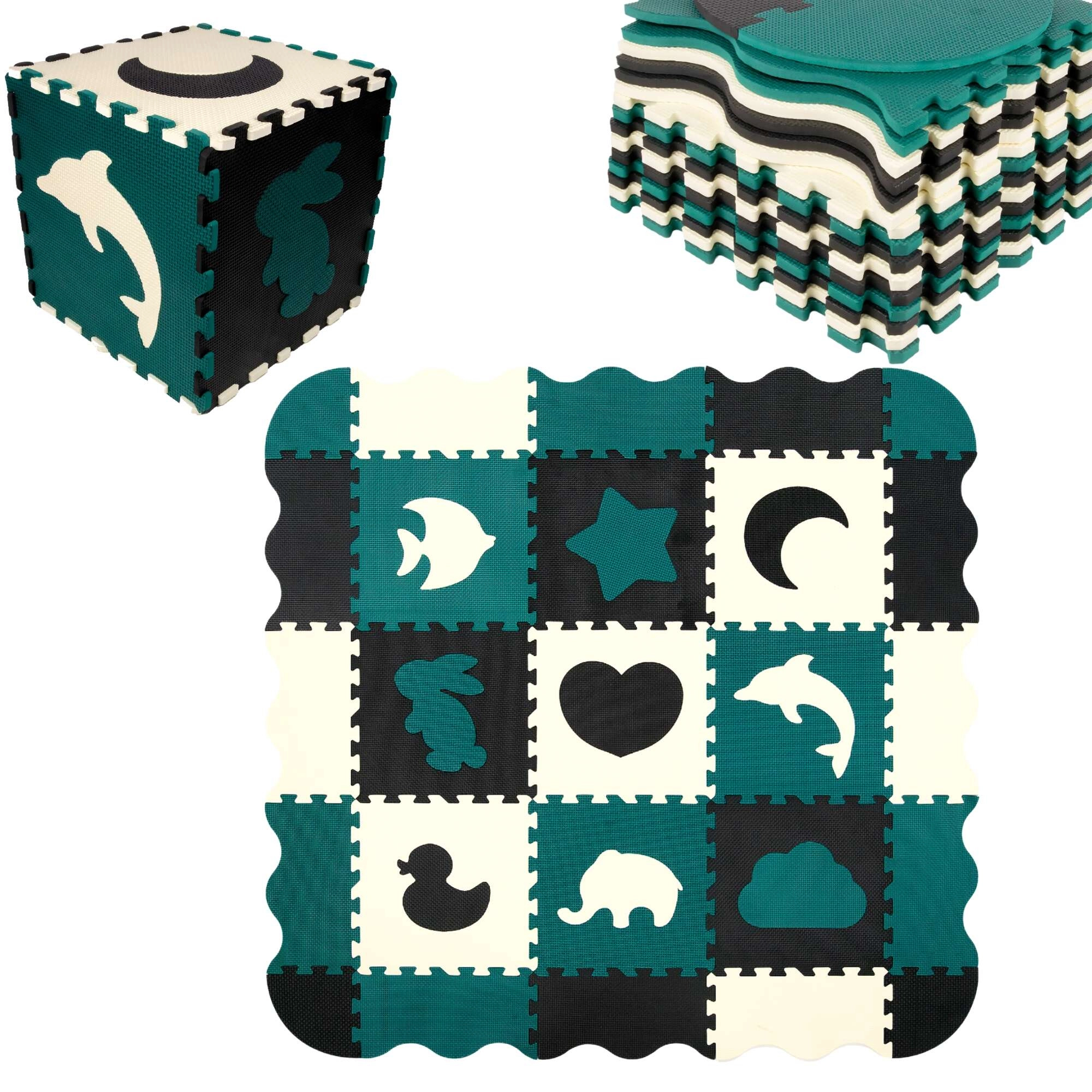 Les pièces servent aussi de puzzle 3D – les motifs d’animaux et de formes amovibles peuvent être assemblés pour créer des objets en volume (p. ex. un cube), ce qui développe chez l’enfant la représentation spatiale, la prééhension et la coordination. Le matériau EVA est sans phtalates, formamide, BPA et PVC, conforme aux normes EN 71 et REACH et porte le marquage CE.