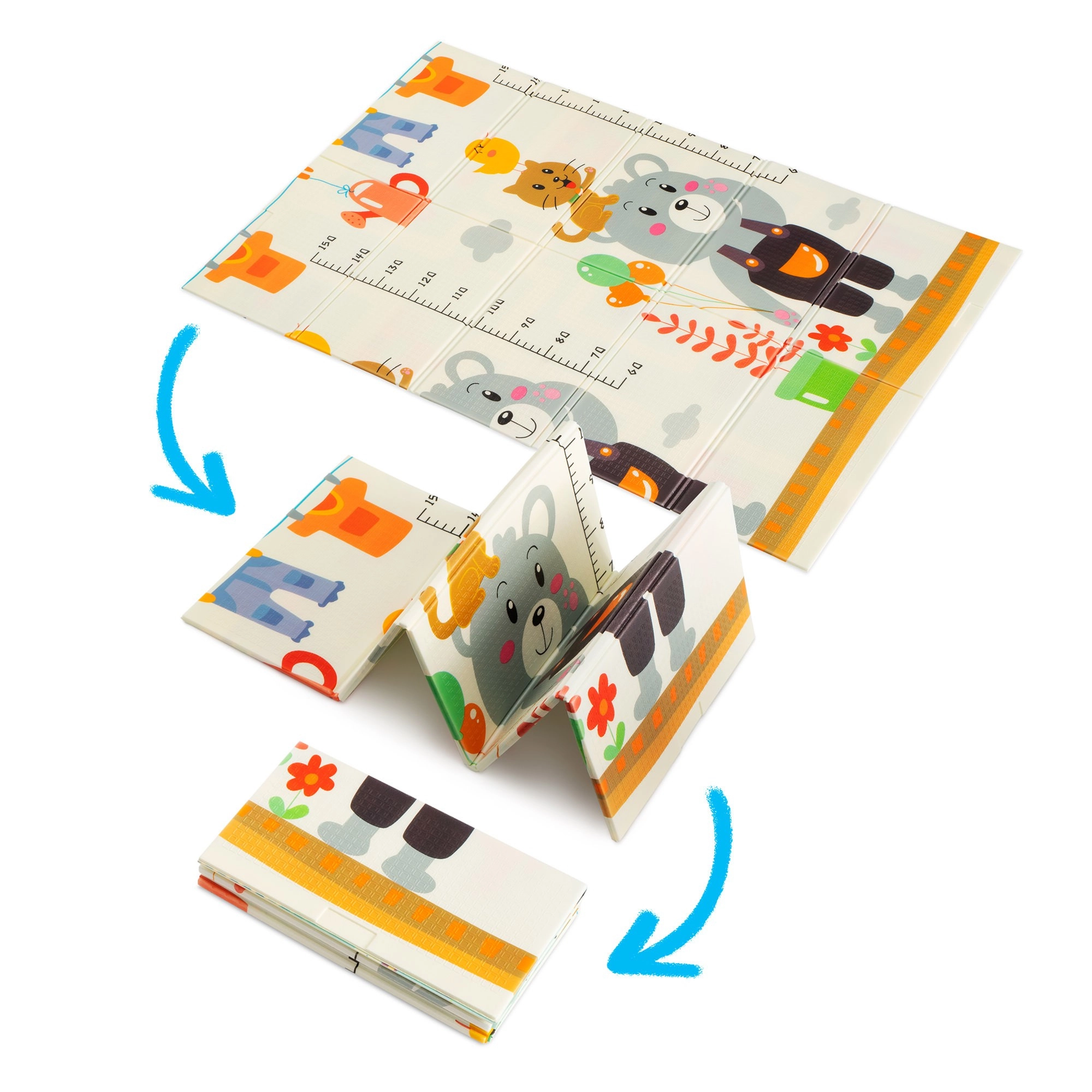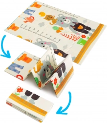 Le design réversible propose deux motifs éducatifs : de joyeux animaux avec une toise pour suivre la croissance et des routes avec bâtiments et véhicules pour développer l’imagination. Le tapis se plie en quelques secondes, se range facilement et, grâce au sac zippé fourni, vous l’emportez partout : salon, chambre d’enfant, balcon, jardin et en voyage.