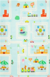Un côté propose des motifs d’animaux joyeux avec une toise de hauteur, l’autre des routes et bâtiments colorés pour stimuler l’imagination et les sens.