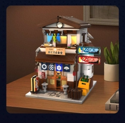Ce kit sophistiqué présente une maison japonaise traditionnelle avec une cuisine au rez-de-chaussée et un salon à l’étage. Grâce au toit amovible et à la possibilité de déplacer un pan de mur, vous pouvez facilement jeter un œil à l’intérieur et profiter de tous les petits détails. Le éclairage LED intégré recrée l’ambiance nocturne des ruelles de Tokyo et confère au modèle une touche unique.