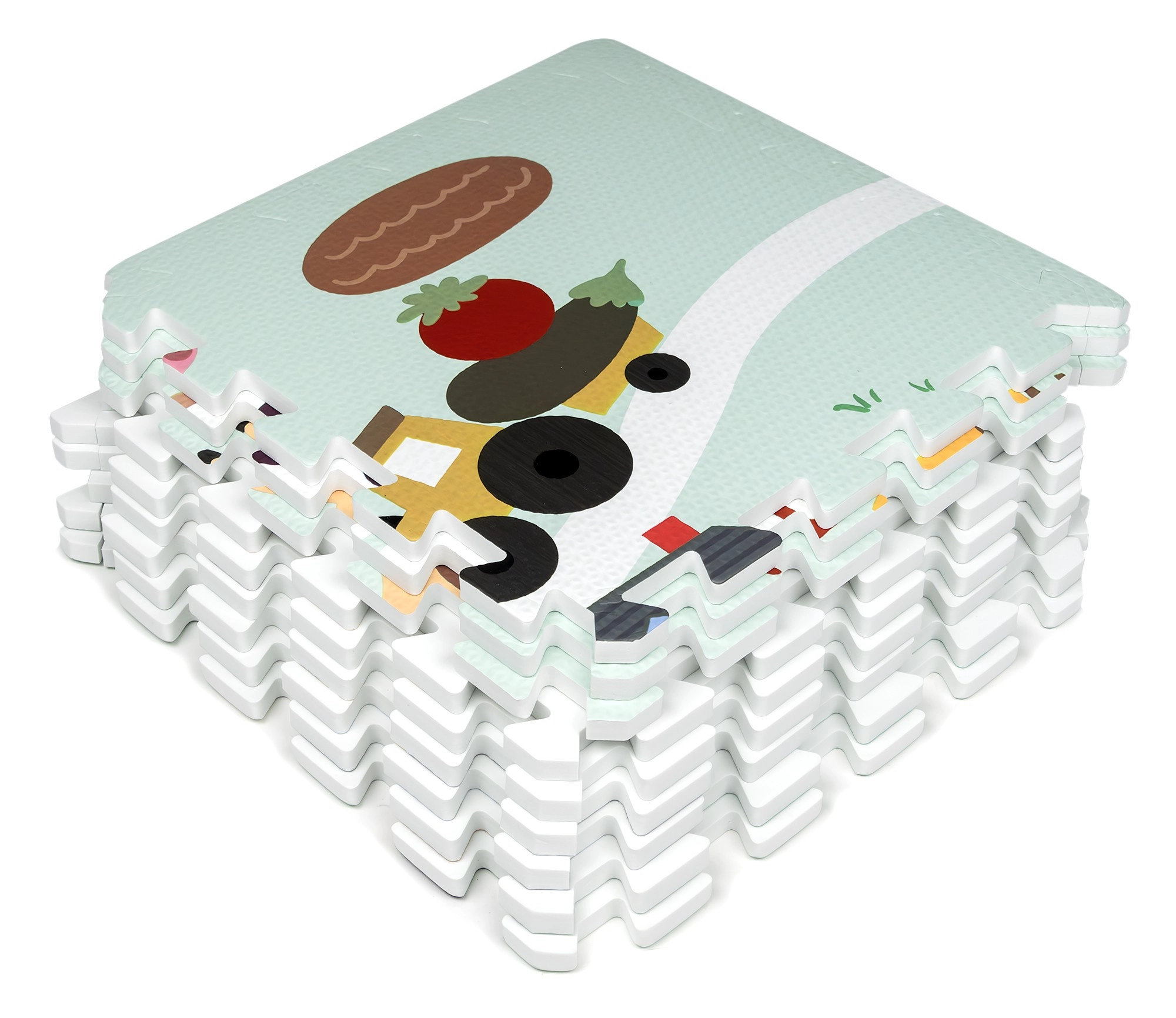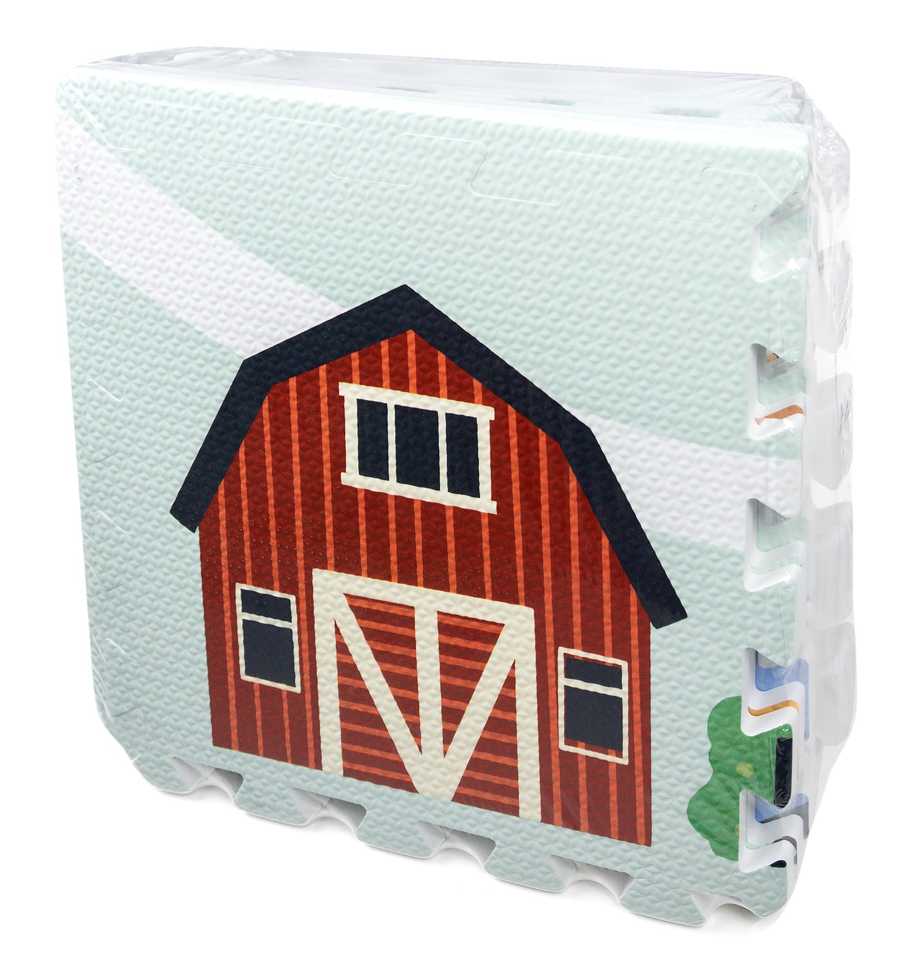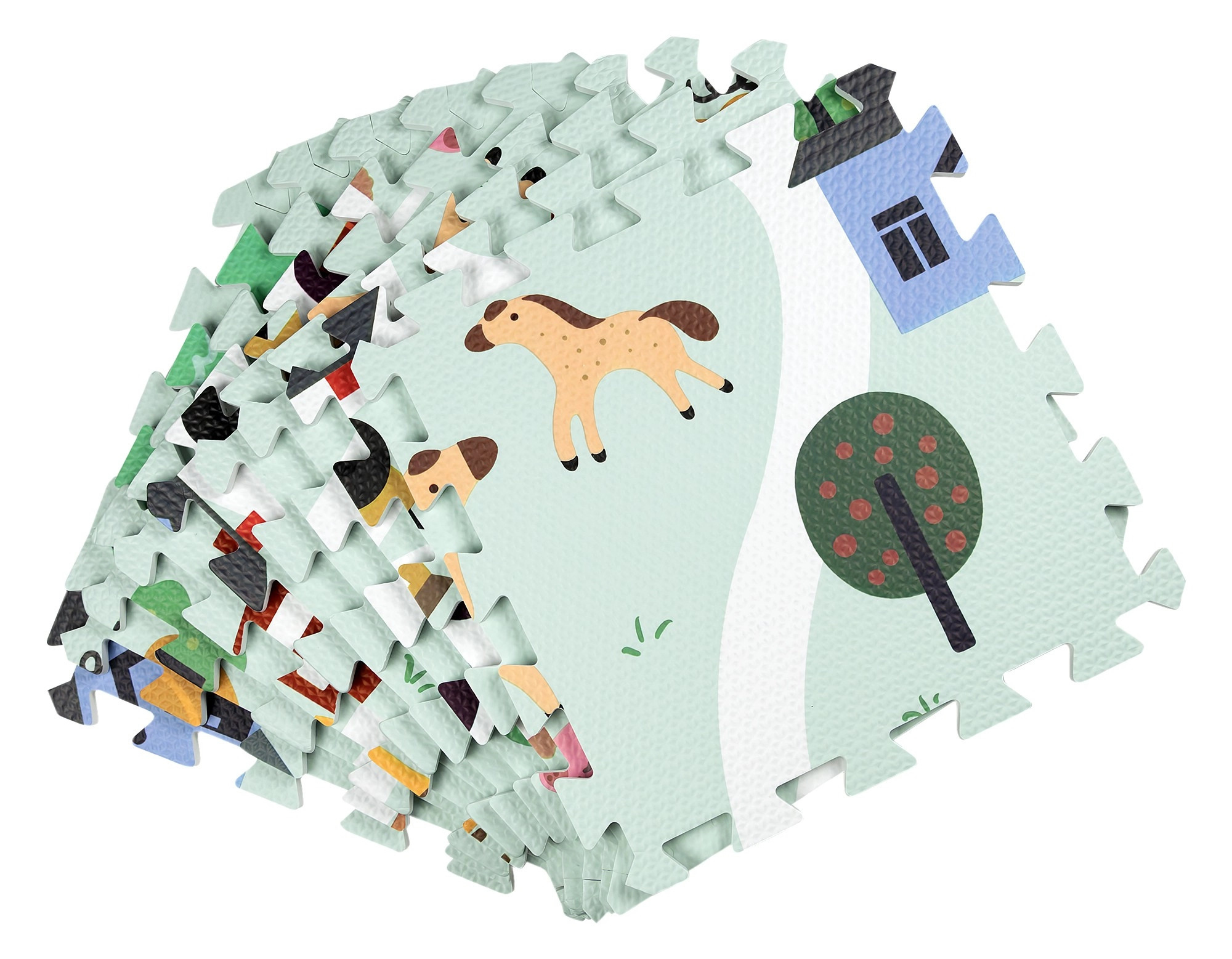 Tapis pour enfants en mousse EVA, doux et sûr, composé de 9 pièces de 30 × 30 cm avec motif de ferme. Offre une isolation contre le froid, un amortissement des chutes et une surface antidérapante. Il est étanche, facile à nettoyer et grâce aux bordures, les pièces permettent de créer une surface plus grande ou des formes 3D (par ex. un cube). Convient dès la naissance, sans phtalates, formamide, PVC ni BPA, conforme aux normes EN 71 et REACH.