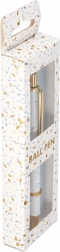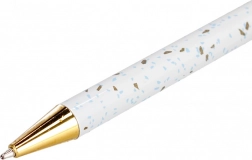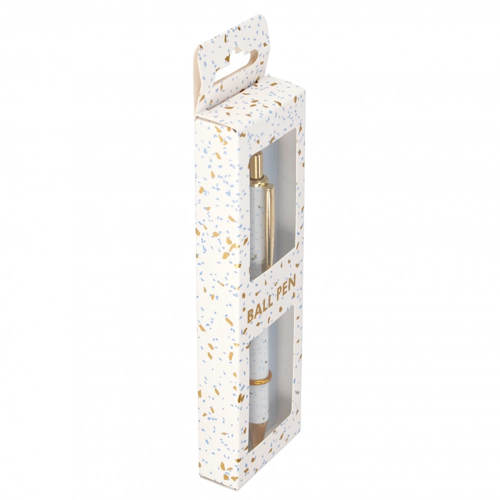 Le design terrazzo moderne, blanc avec accents dorés et bleus, est complété par des détails métalliques élégants qui conviennent aussi bien au bureau qu’en petit cadeau. La longueur du stylo est d’environ 14 cm, il tient parfaitement en main et dans les étuis standard.