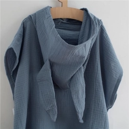 Un poncho en mousseline pour enfants New Baby Feeling, léger et absorbant, en bleu, idéal après le bain à la maison, à la piscine ou au bord de l’eau. Grâce au tissu 100 % coton, il est aéré, doux pour la peau et offre une excellente protection contre le froid. La coupe ample et pratique avec de jolies petites oreilles et des pressions latérales facilite l’enfilage et accompagne la croissance de l’enfant.