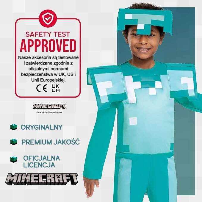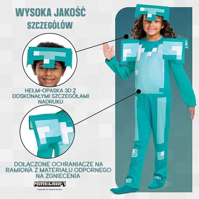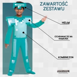 Ce costume MINECRAFT armure de diamant officiellement licencié transforme les enfants en héros de leur jeu préféré. La combinaison douce à motif pixel et les épaulières marquées sont complétées par un casque léger qui confère au costume son aspect iconique. Grâce aux matières agréables, le costume reste confortable même lors d’un port prolongé.