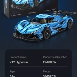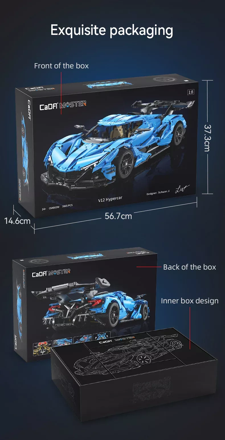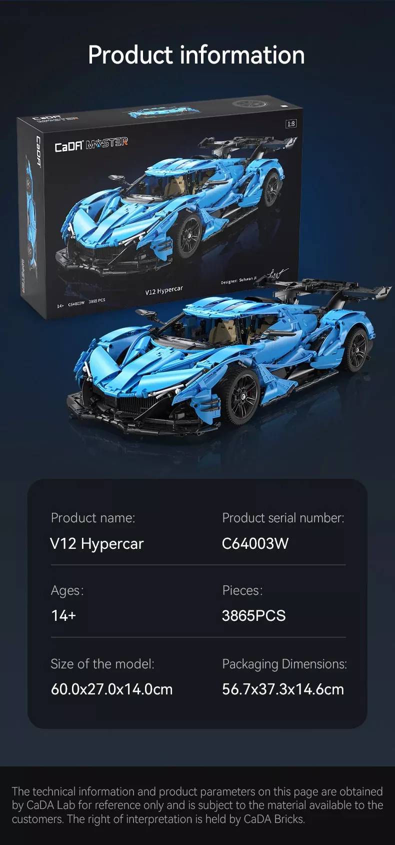 Ce modèle grand format d’hypercar V12 de la gamme CADA Master ravira tous les fans de kits techniques. Lors du montage, profitez d’éléments mécaniques ingénieux qui renforcent le réalisme : de la direction fonctionnelle aux portes ouvrantes, jusqu’aux détails authentiques du cockpit. Grâce à sa carrosserie bleue élégante, il deviendra une pièce maîtresse de toute collection.