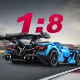 Intérieur aux détails réalistes – sièges sport, tableau de bord, levier de vitesses et volant. La carrosserie bleue avec des accents noirs et un grand aileron arrière se distingue en vitrine.