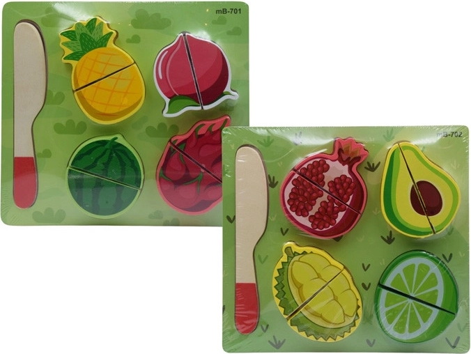 Vous pouvez choisir entre deux variantes de fruits. Les pièces tiennent bien entre elles, tout en se séparant facilement avec le couteau en bois, offrant une expérience réaliste de « découpe » sans risque de blessure. Parfait pour la maison, les maternelles ou comme cadeau.