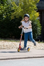 Le frein arrière à pédale, le plateau antidérapant et les roues silencieuses offrent assurance et contrôle sur toutes les surfaces.