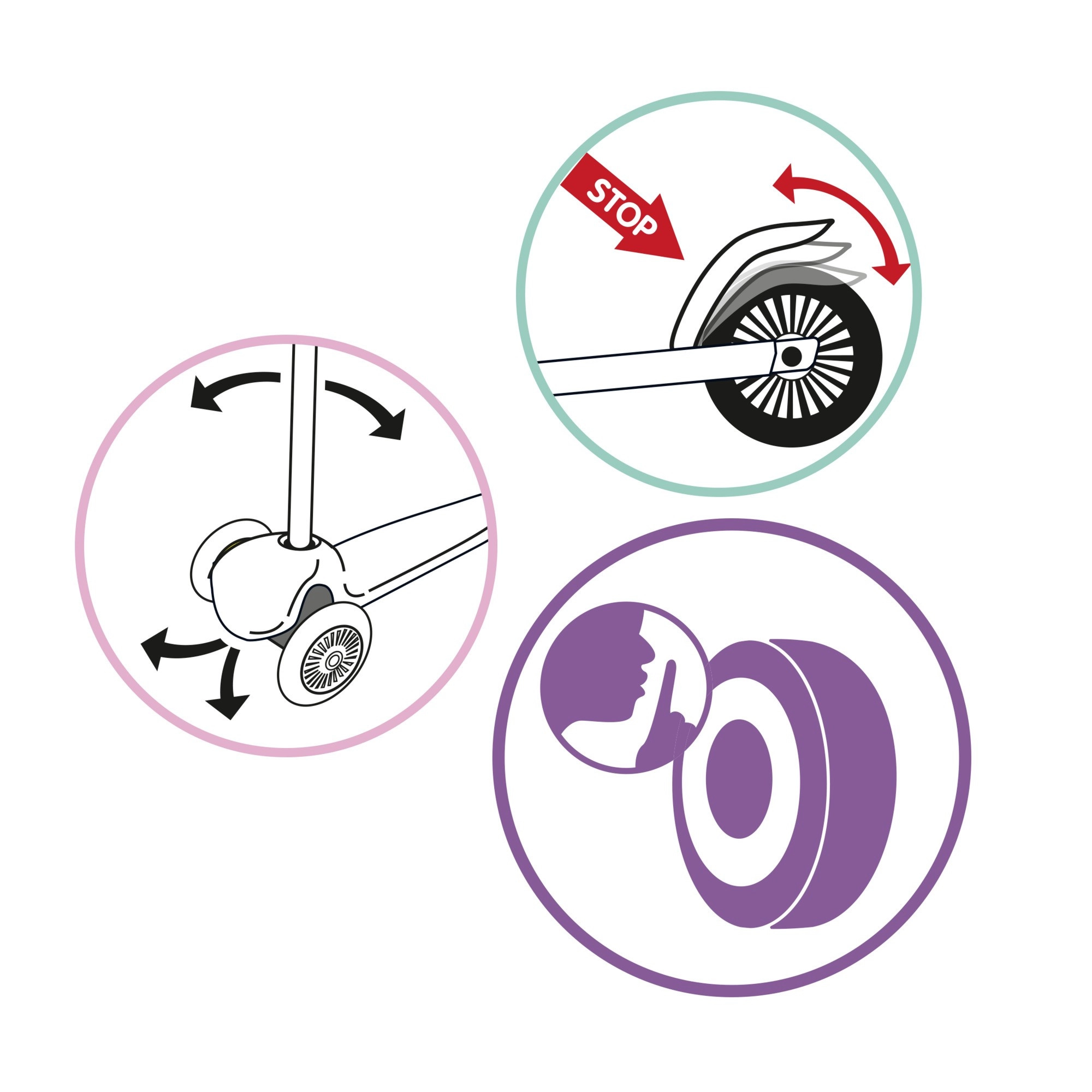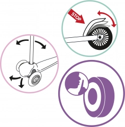 La sécurité avant tout : le frein arrière à pied permet un arrêt rapide et fluide, tandis que les roues silencieuses assurent un fonctionnement souple sans bruit superflu. La trottinette est parfaite pour développer la motricité, la coordination et la confiance en soi des enfants.