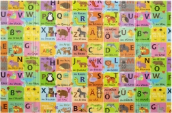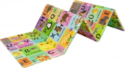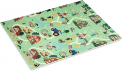 Chaque côté propose un univers différent : un alphabet coloré avec des images pour les premiers mots et un paysage de village vivant pour des jeux imaginatifs avec petites voitures et animaux.