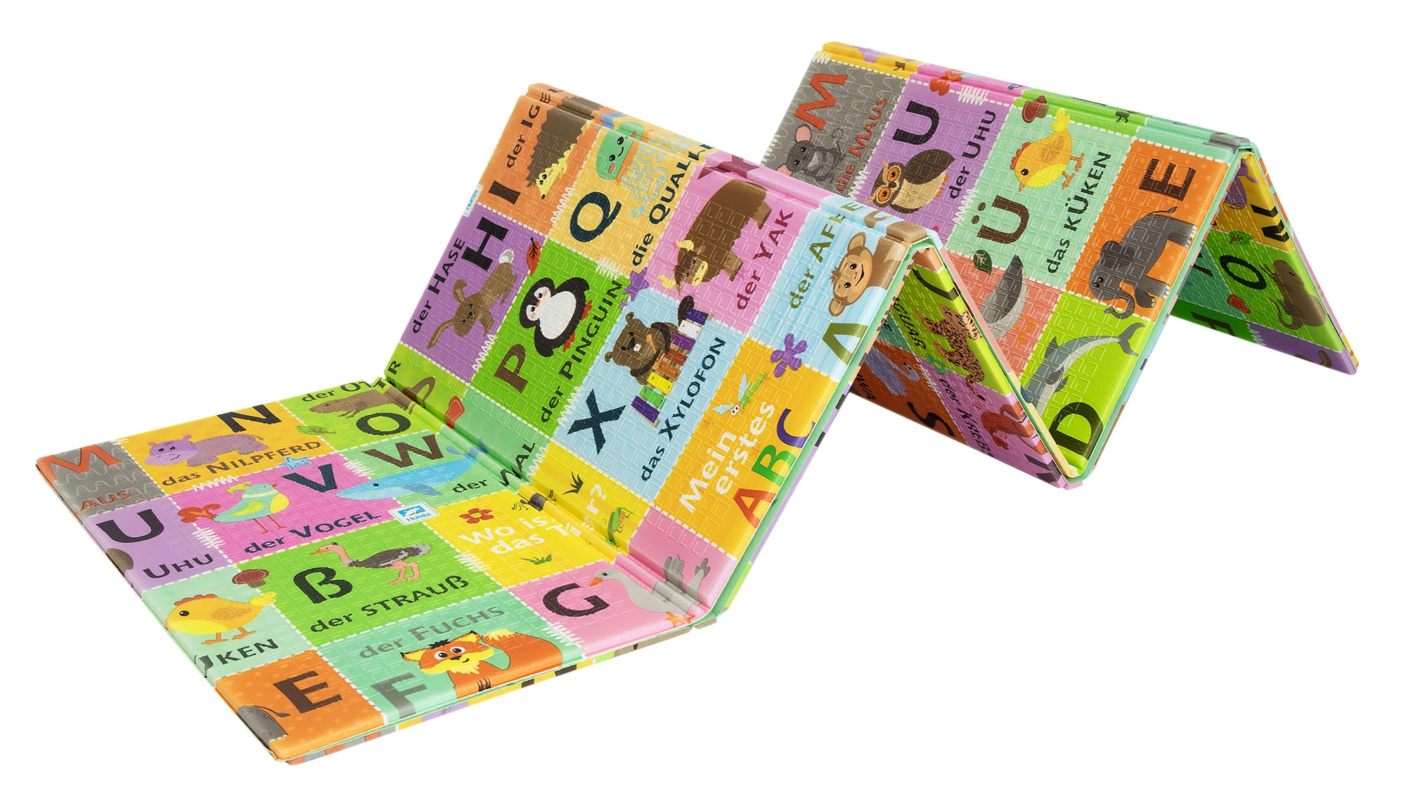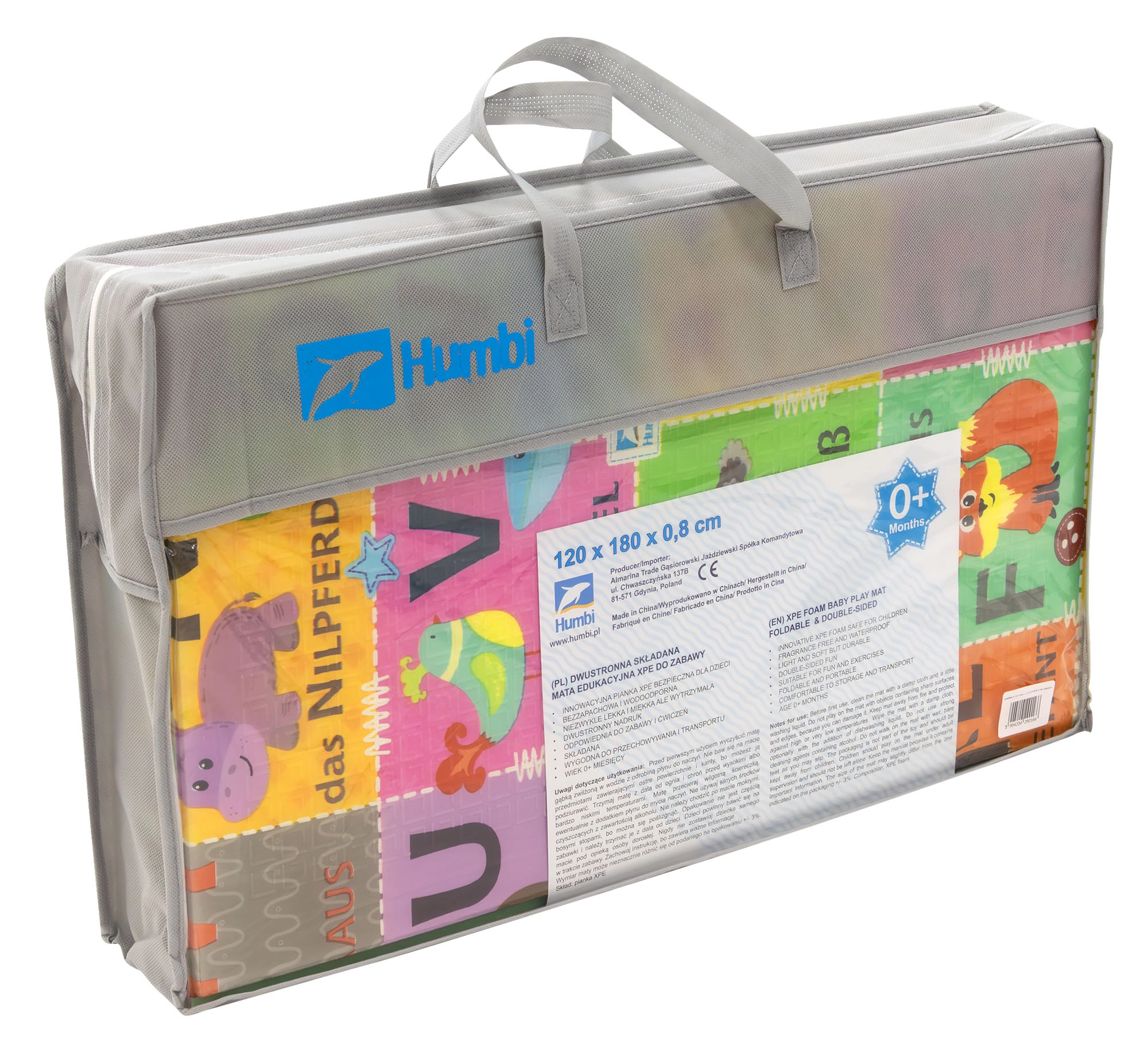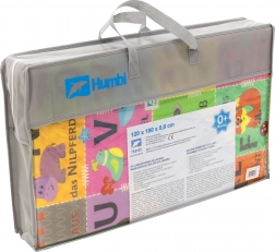Le tapis HUMBI en mousse XPE inodore de qualité est résistant, souple et agréablement doux. Sa conception double face propose deux visuels éducatifs : alphabet allemand illustré et thème de la vie à la ferme pour stimuler l’imagination. Avec ses dimensions 120 × 180 × 0,8 cm, il offre assez d’espace pour jouer, ramper et faire ses premiers pas.