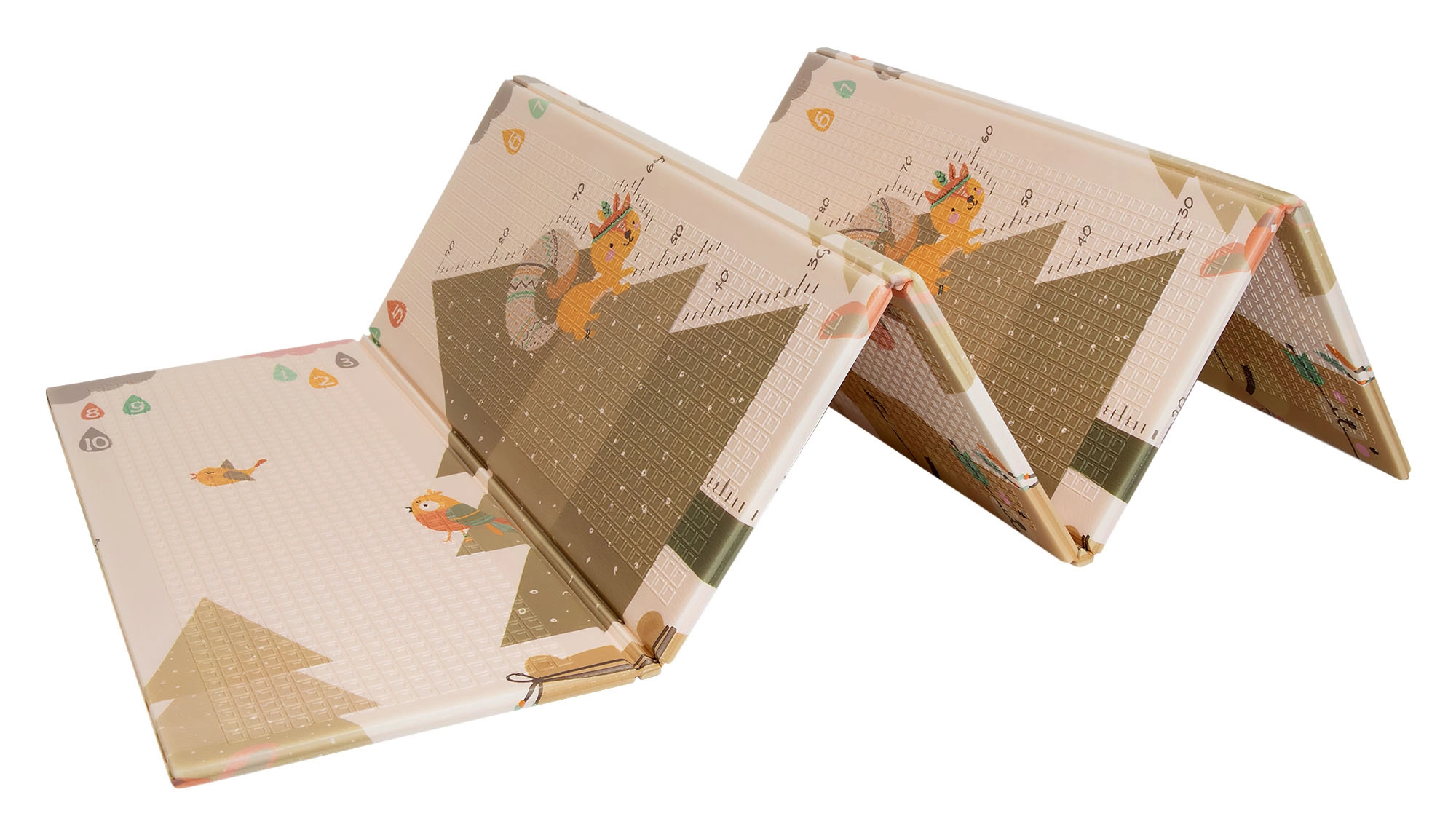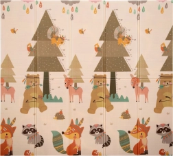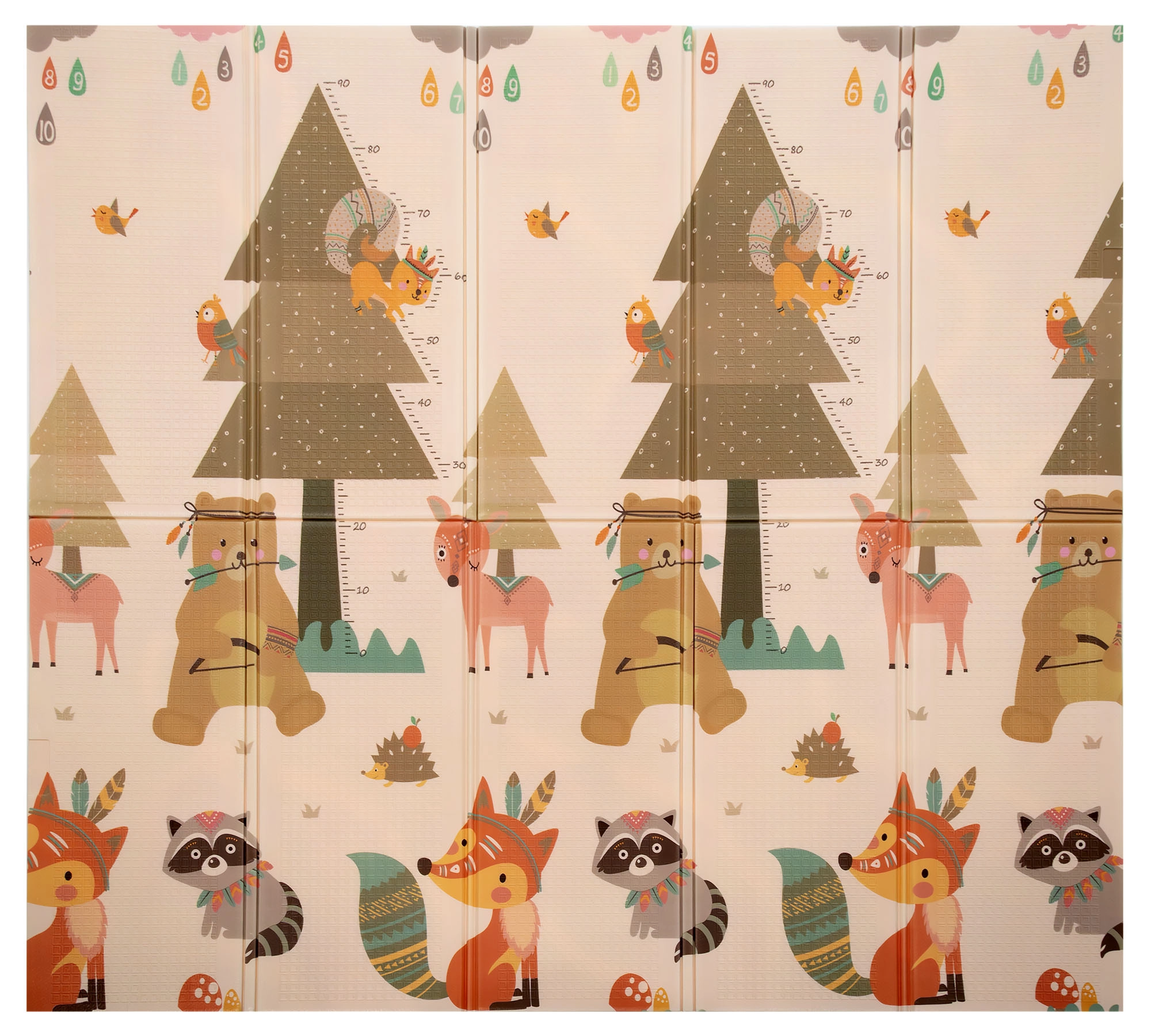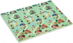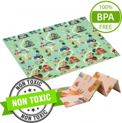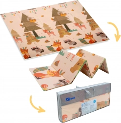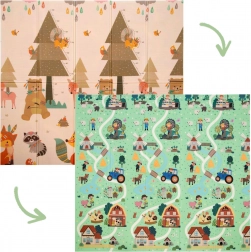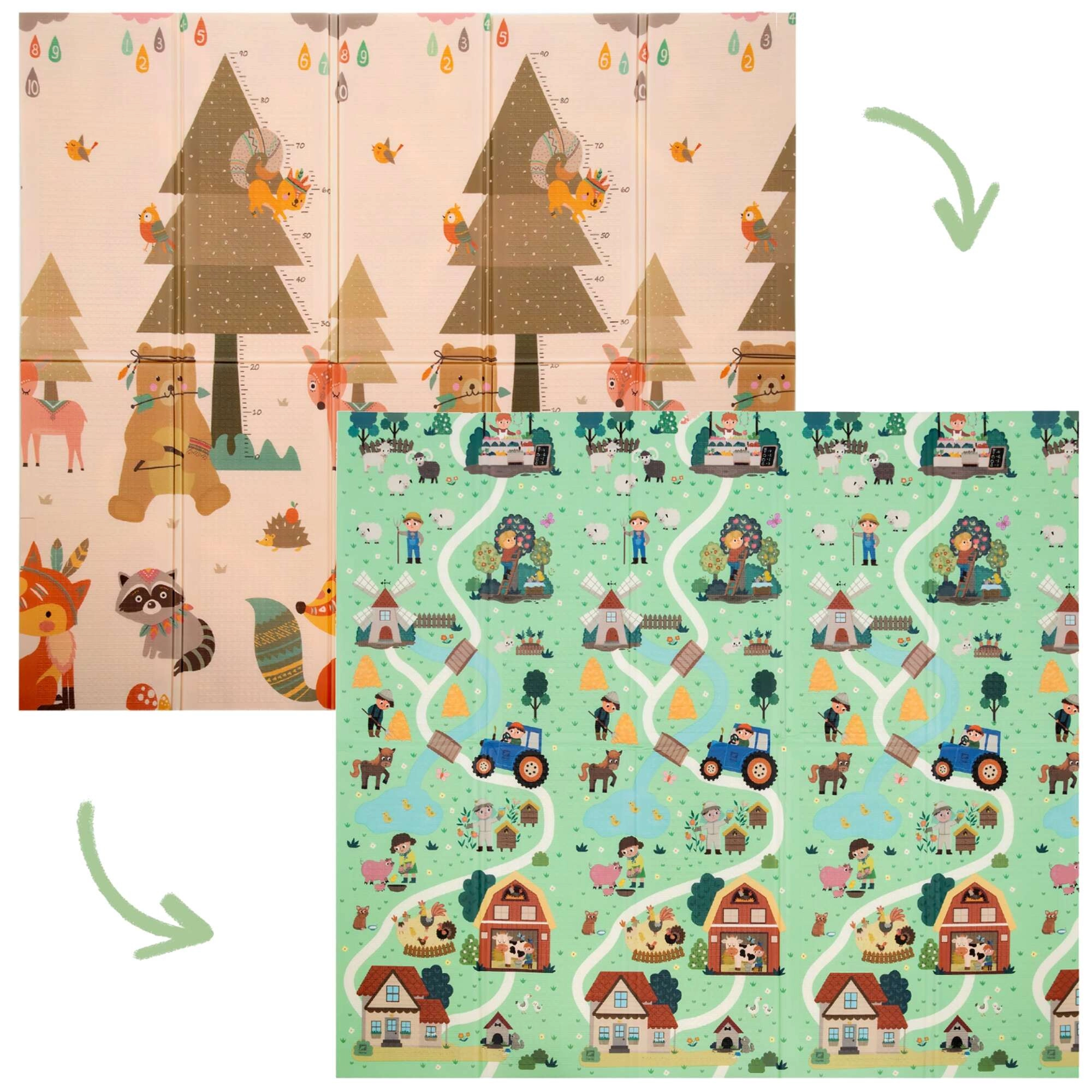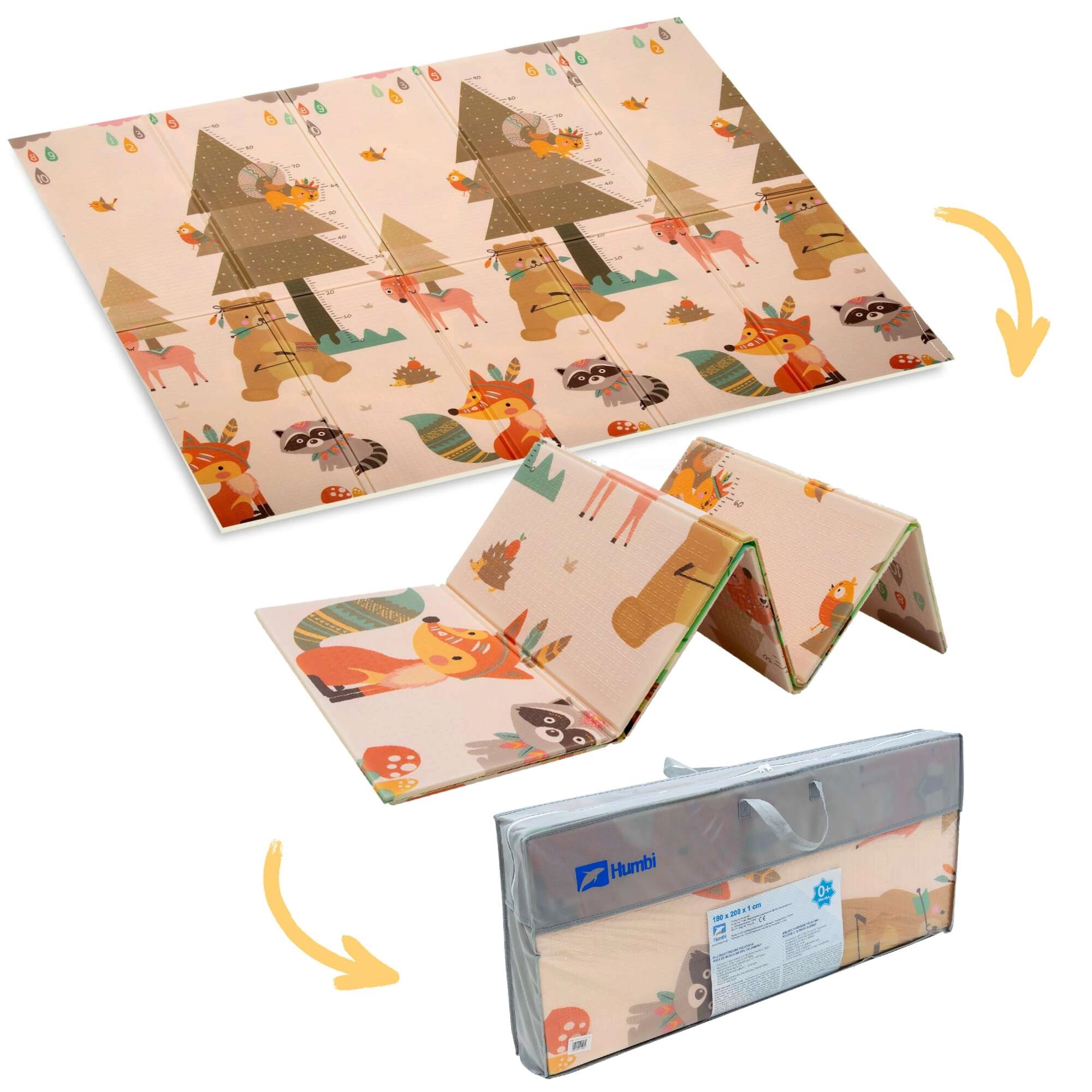 Grand tapis de jeu double face en mousse XPE de la marque Humbi offrant aux enfants dès la naissance un confort moelleux, de la sécurité et une excellente isolation thermique. Grâce à sa construction pliable et au sac de transport fourni, il se range et s’emporte facilement. Il est imperméable, facile à nettoyer, sans substances nocives et propose deux faces éducatives attrayantes : animaux de la forêt et motifs de village avec routes pour s’amuser et stimuler l’imagination.