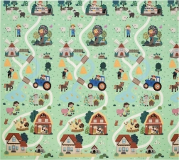 Une face avec des animaux de la forêt et des toises de mesure, l’autre avec des routes et un village. Stimule l’imagination, favorise la motricité et offre sans cesse de nouveaux jeux.