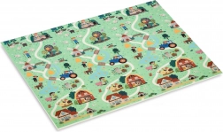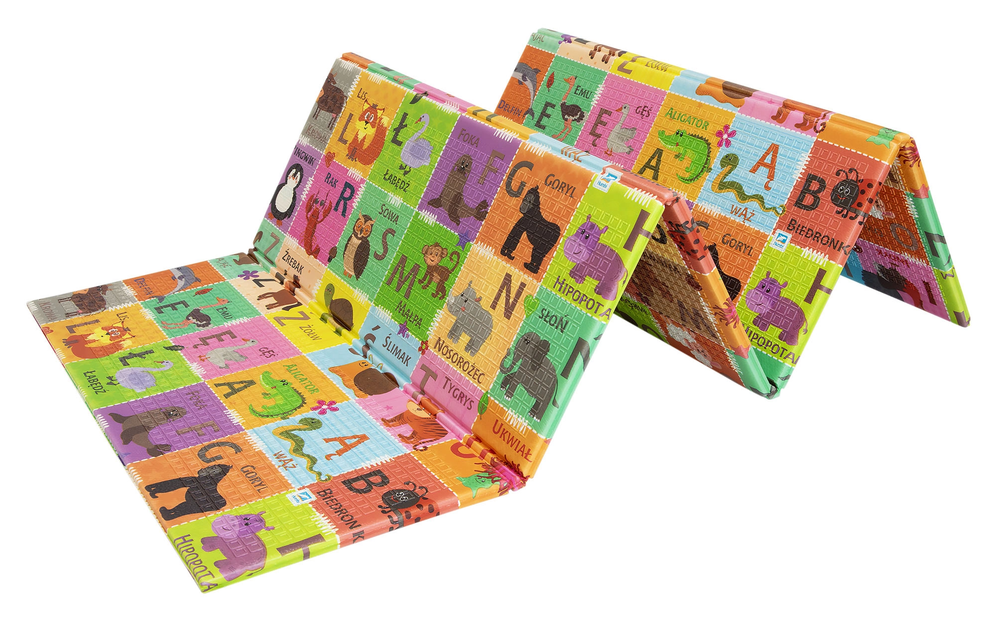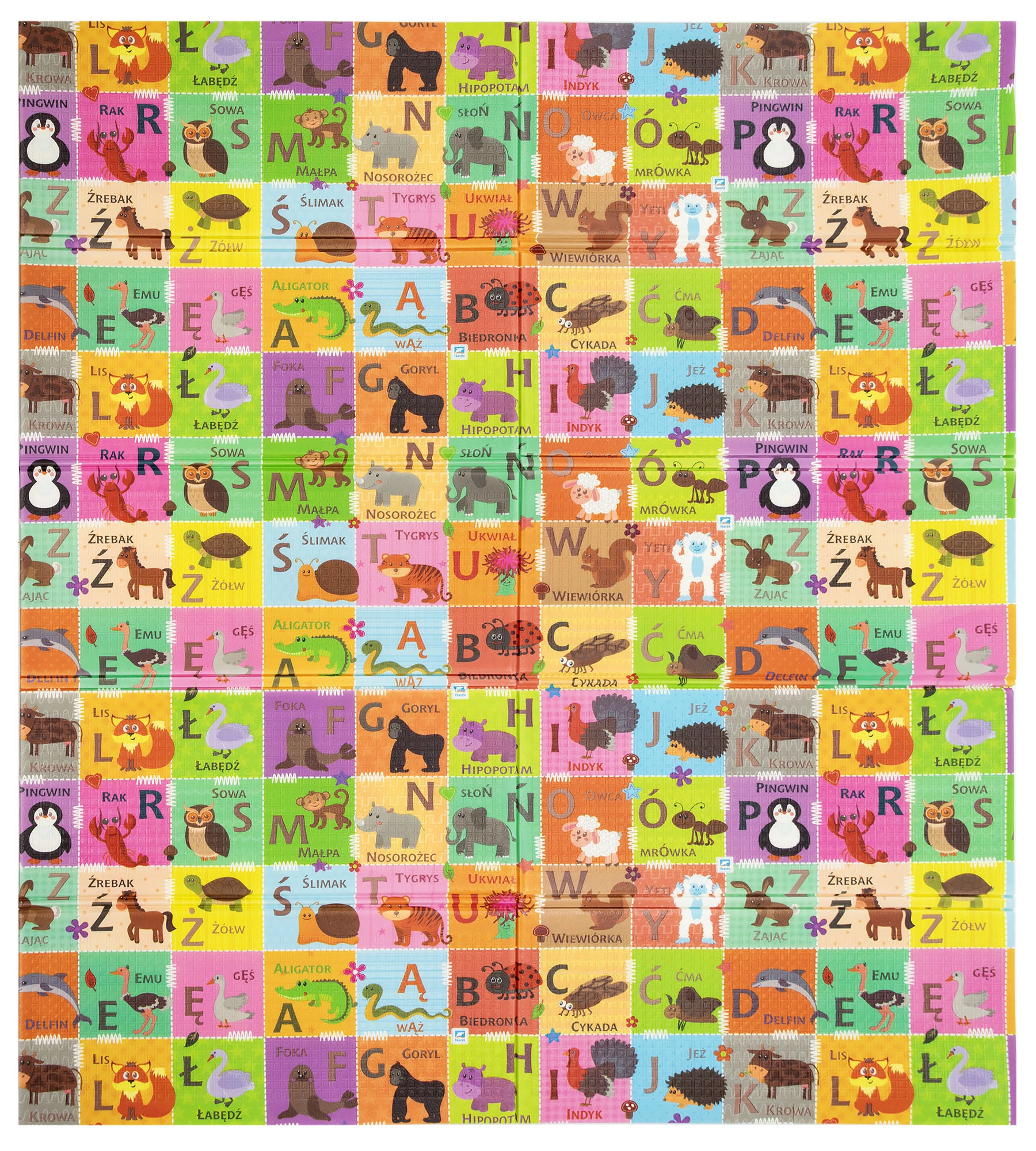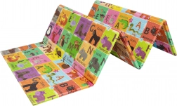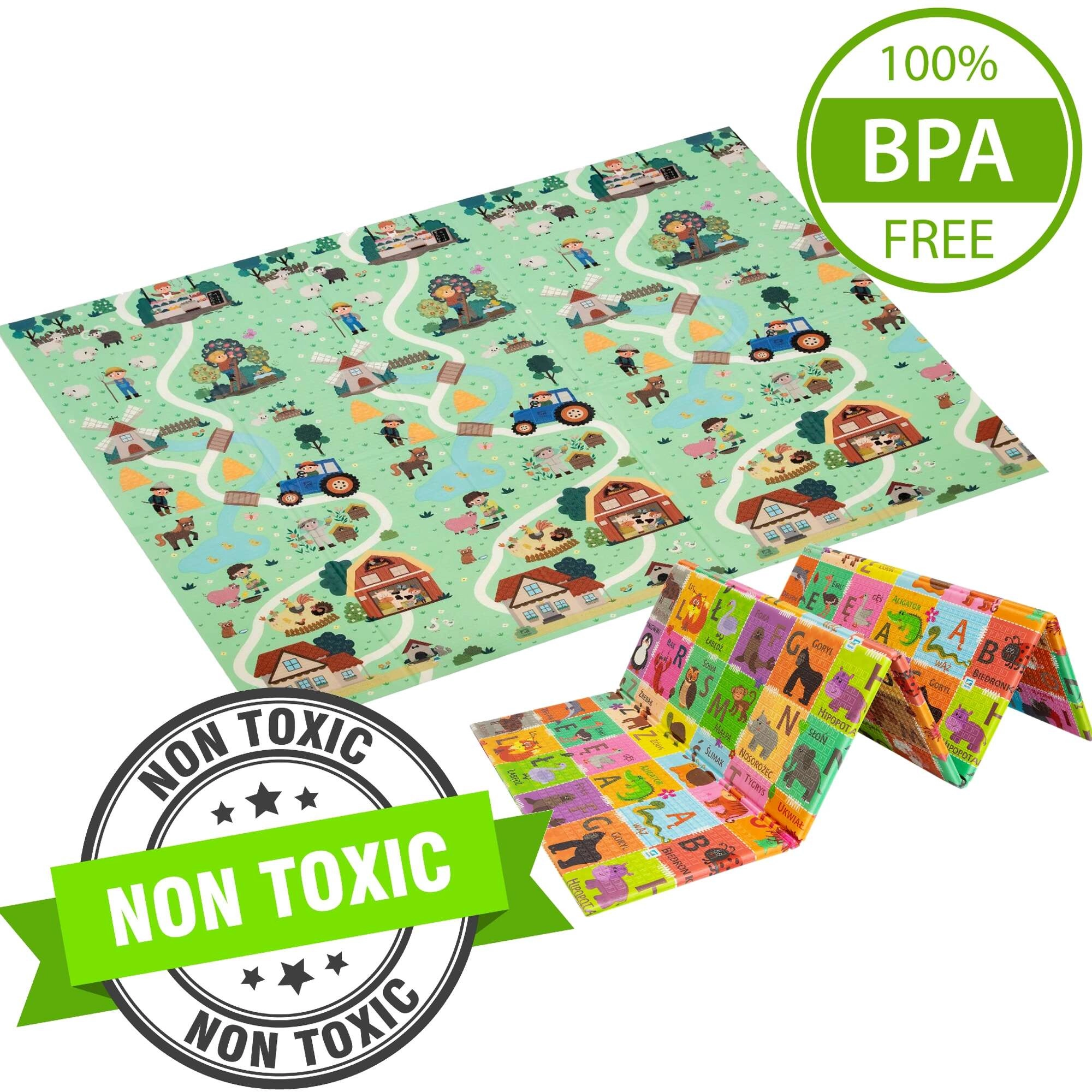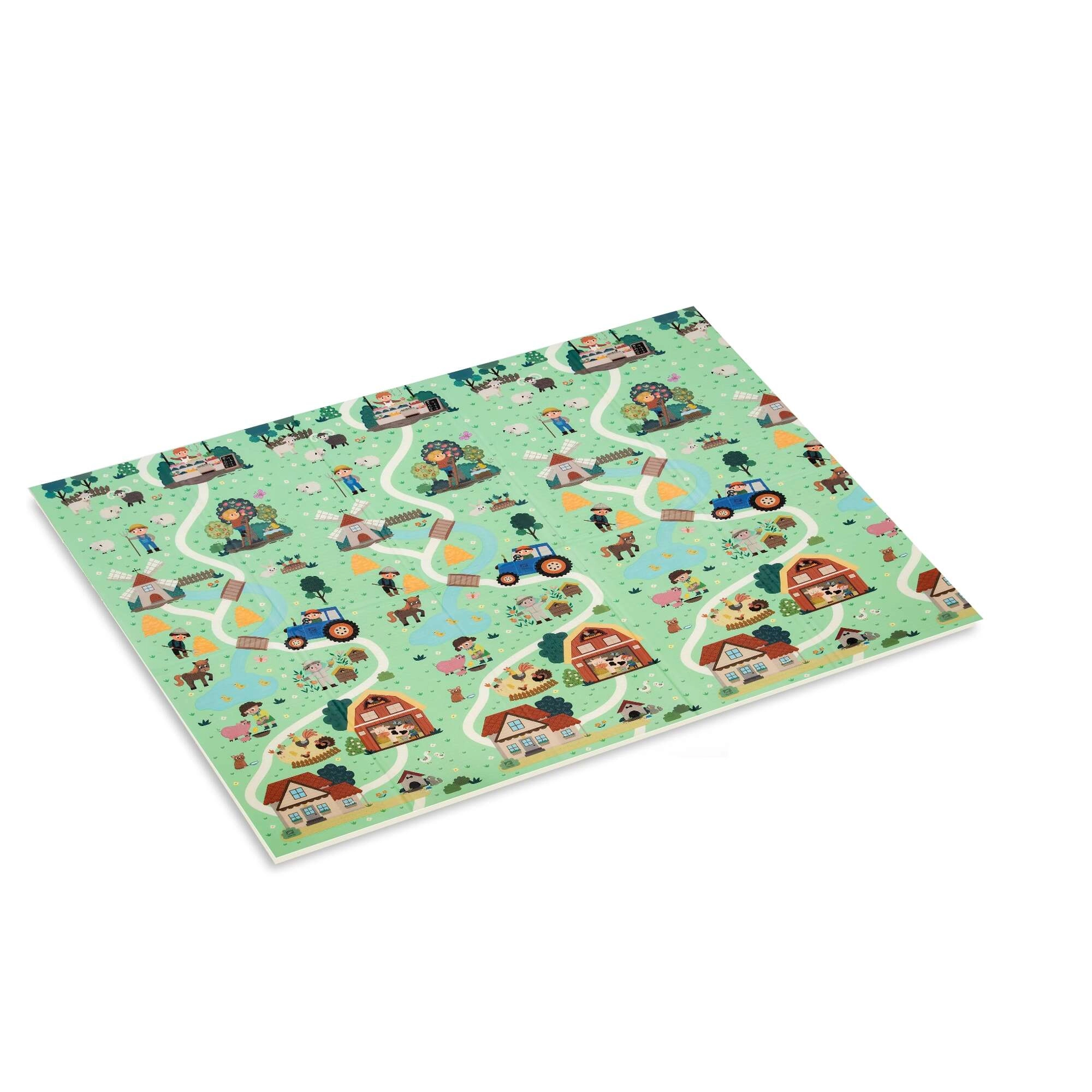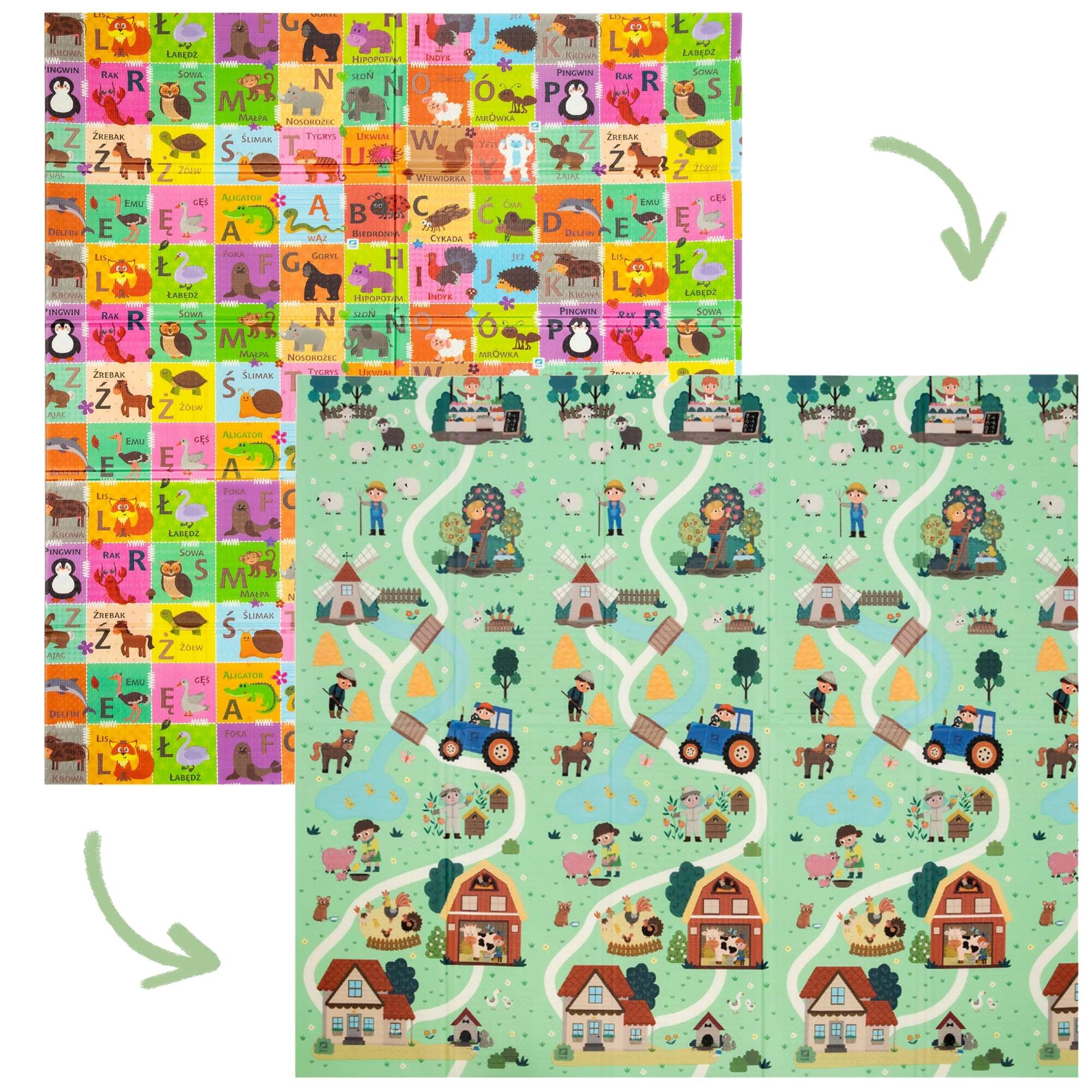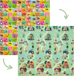 Une face avec un alphabet coloré et des animaux stimule le vocabulaire, l’autre face avec un motif de ferme et de routes est idéale pour jouer avec des petites voitures et développer l’imagination.