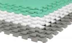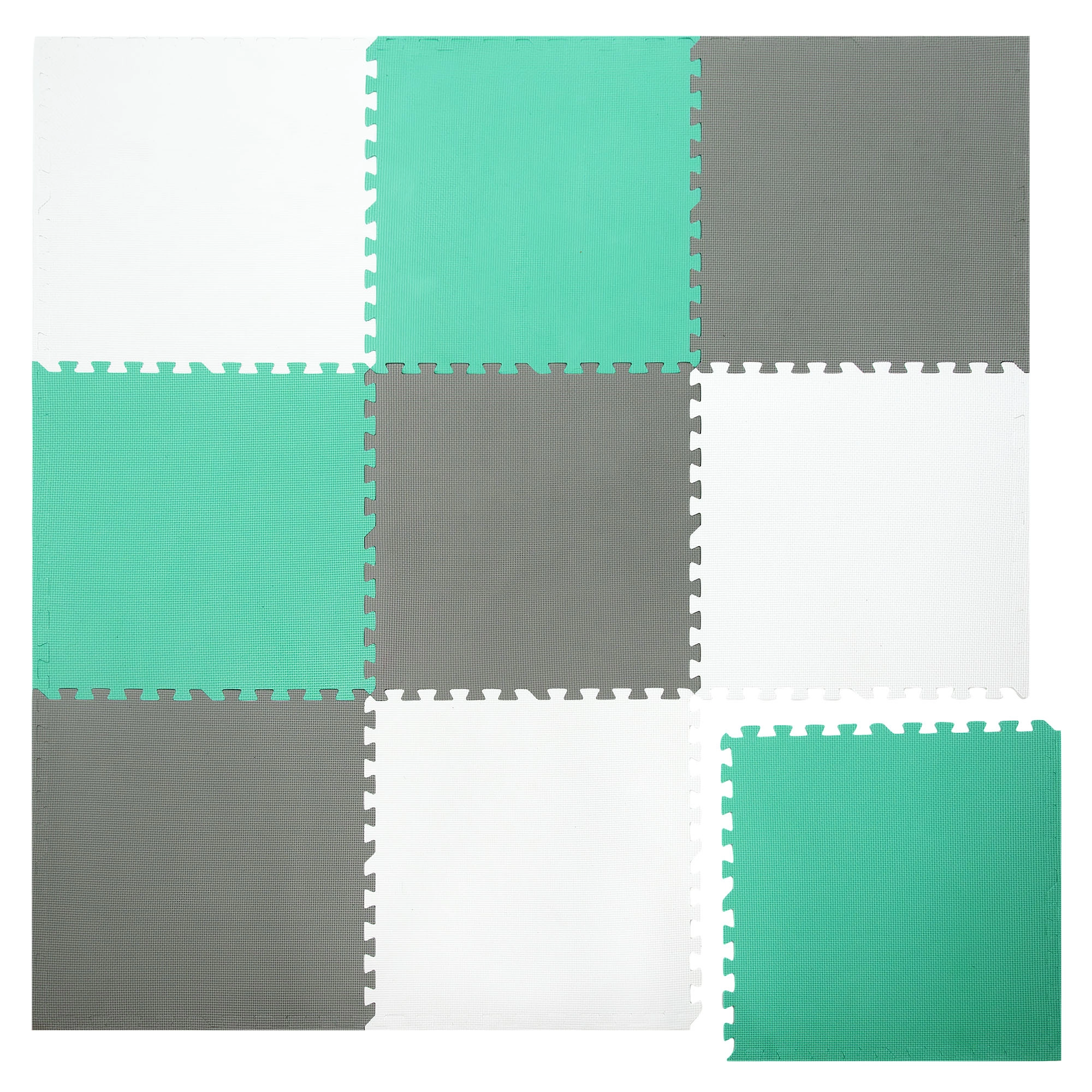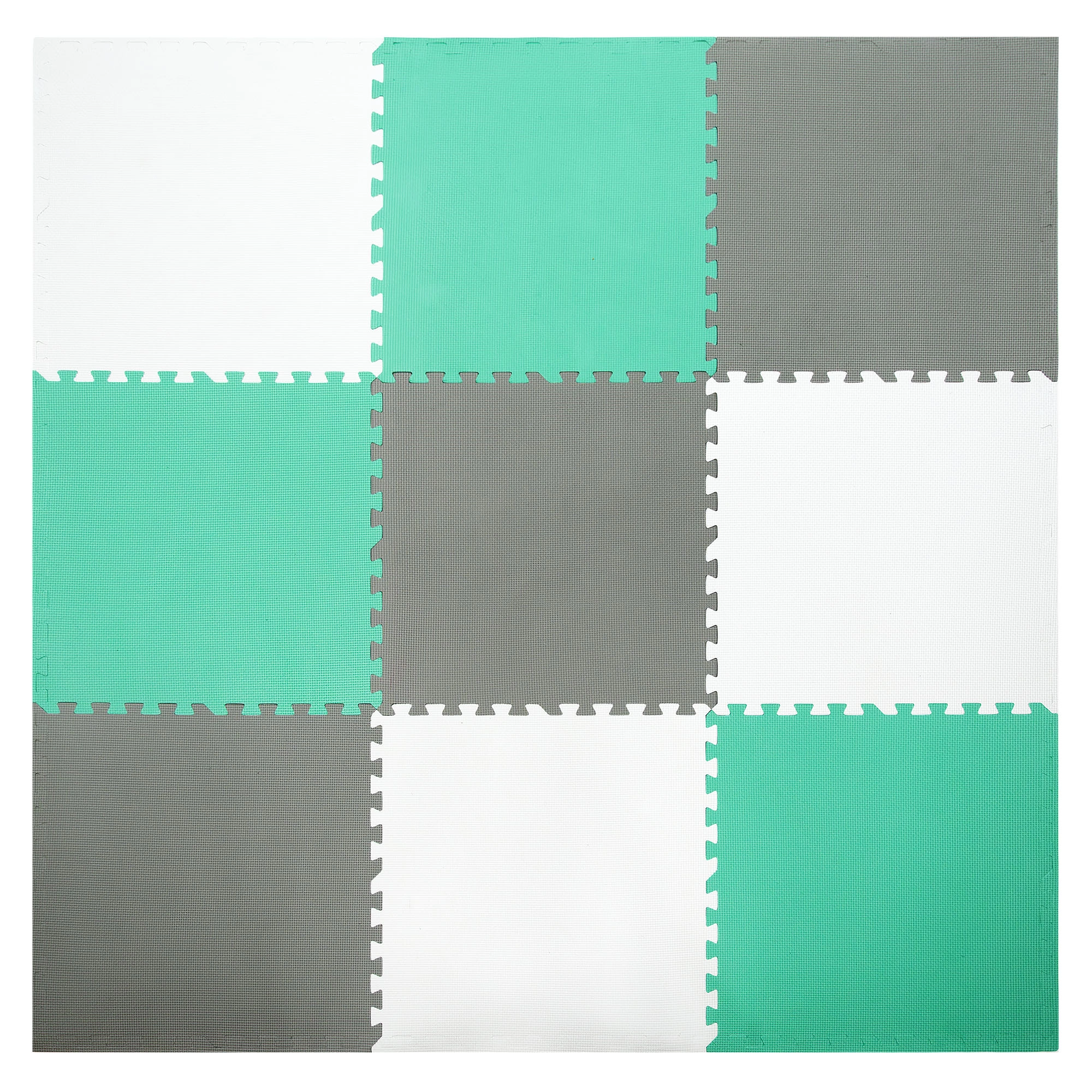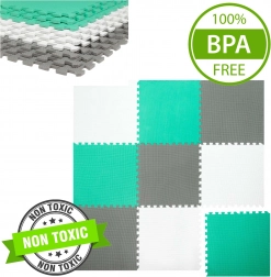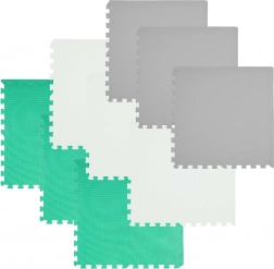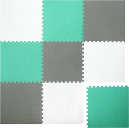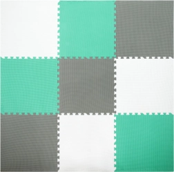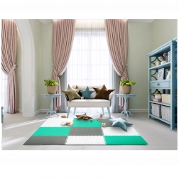 Les 9 grandes pièces de 60 × 60 cm (avec 18 bordures) s’assemblent facilement pour former une surface de 180 × 180 cm, ou peuvent être combinées avec un autre set du même modèle pour créer une zone de jeu plus vaste. Le matériau est étanche et facile à nettoyer – un simple coup de chiffon humide suffit. Les couleurs neutres menthe, gris et blanc s’intègrent à tous les intérieurs sans distraire les enfants.