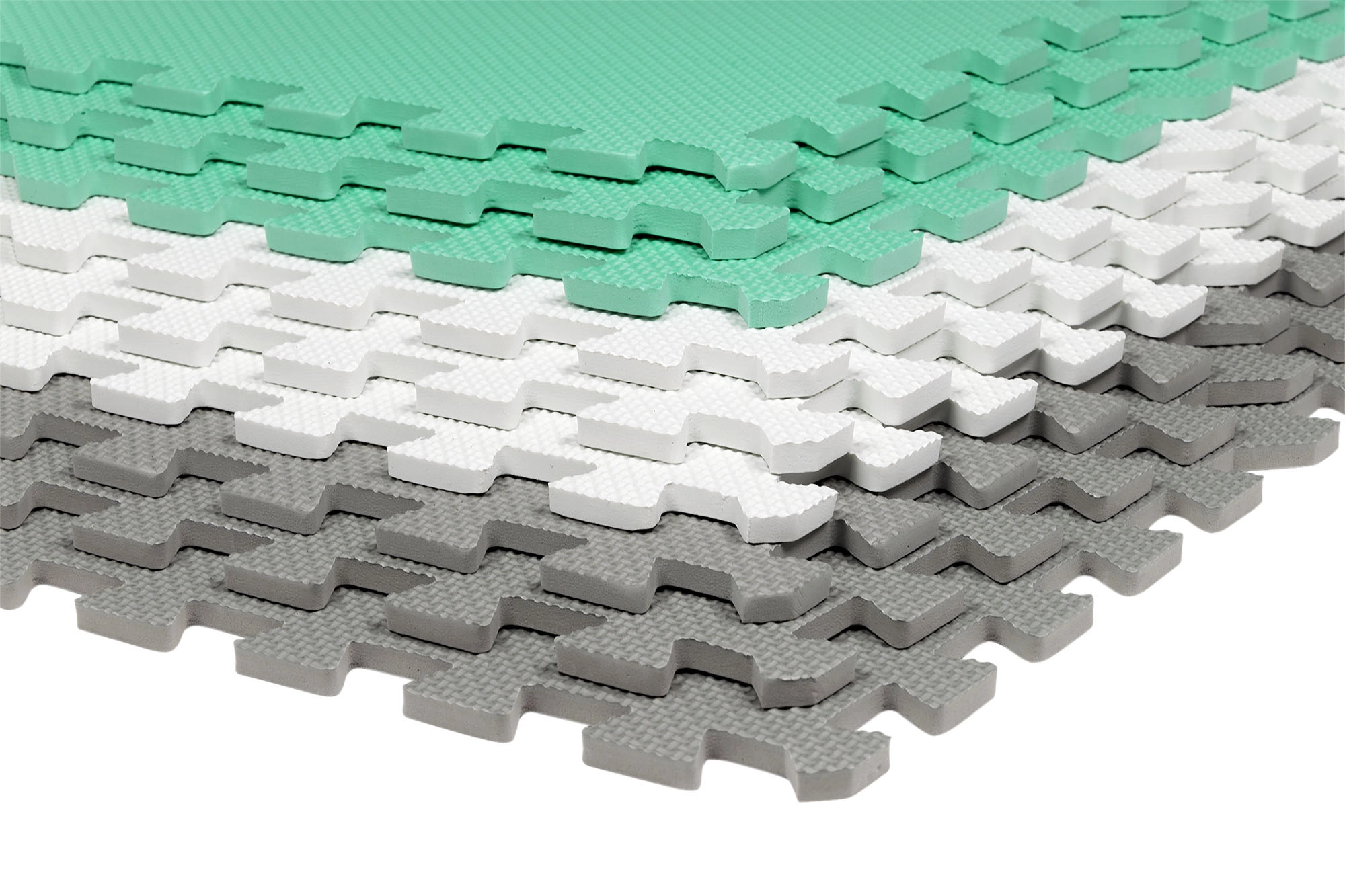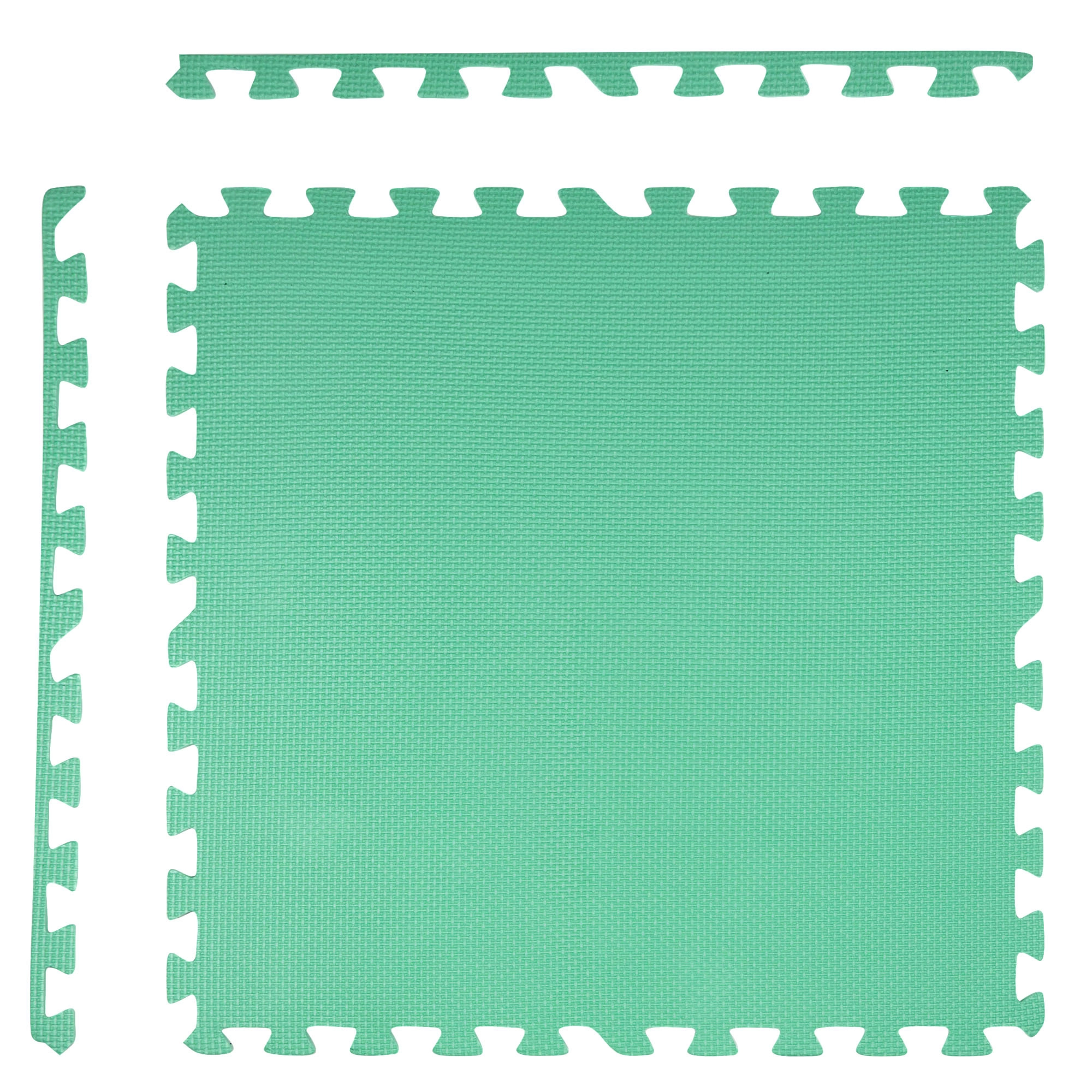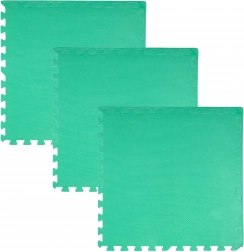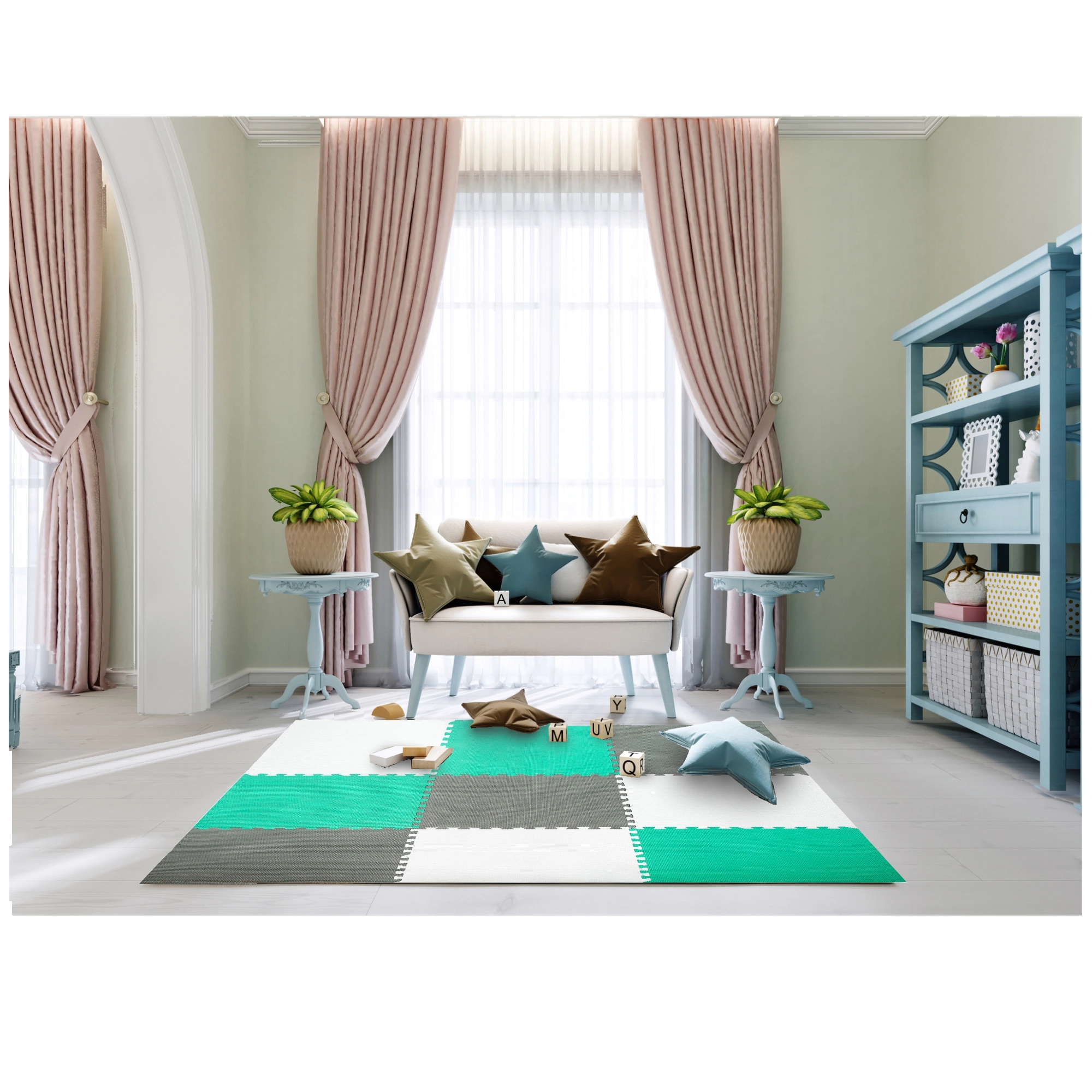 Les 9 grandes pièces de 60 × 60 cm (avec 18 bordures) s’assemblent facilement pour former une surface de 180 × 180 cm, ou peuvent être combinées avec un autre set du même modèle pour créer une zone de jeu plus vaste. Le matériau est étanche et facile à nettoyer – un simple coup de chiffon humide suffit. Les couleurs neutres menthe, gris et blanc s’intègrent à tous les intérieurs sans distraire les enfants.