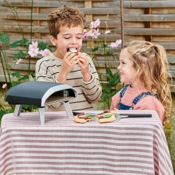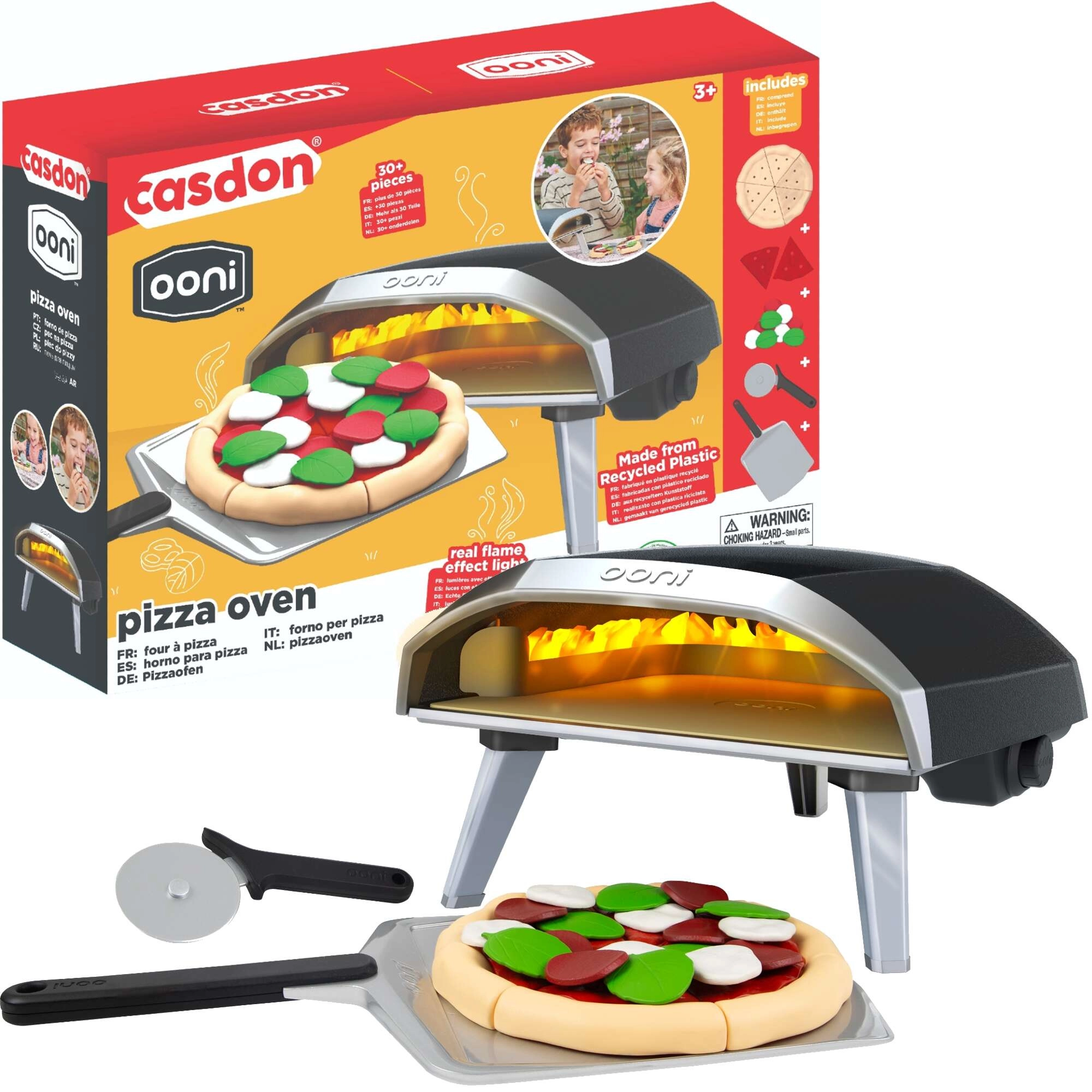 Un four à pizza pour enfants au design moderne noir-argent offre une expérience authentique de préparation de pizza directement sur la table. Les enfants assemblent la pizza à partir de 6 parts de pâte et de « sauce », la décorent avec 18 accessoires puis l’enfournent à l’aide de la pelle. Chaque pièce tient grâce à des connexions pratiques, ce qui facilite la manipulation et assure un jeu fluide.