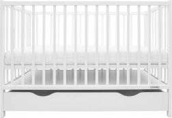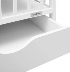 Pratique et sûre, la couchette pour bébé NEW BABY Basic en blanc associe bois de pin massif, 3 positions de sommier et tiroir intégré pour le linge de lit ou les accessoires de bébé. Des matériaux certifiés, un sommier ventilé pour une meilleure circulation de l’air et 3 barreaux amovibles pour un accès facile garantissent confort et sécurité au quotidien.