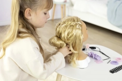 Cette tête de coiffage réaliste est l’outil idéal pour les apprenties coiffeuses et maquilleuses. Les longs cheveux synthétiques blonds et brillants gardent parfaitement leur forme, se coiffent à répétition, se tressent et se stylisent en des dizaines de looks. La base stable facilite le travail et les accessoires comme la brosse, le peigne, les barrettes, les élastiques et les outils de tressage ouvrent la porte à une créativité sans limite.