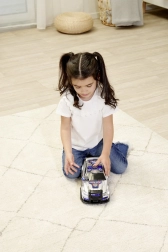 Grâce à sa carrosserie en plastique robuste et à ses grandes roues, la voiture est stable et prête pour un jeu quotidien en intérieur. Idéal comme cadeau pour les jeunes amateurs d’action et de vitesse.