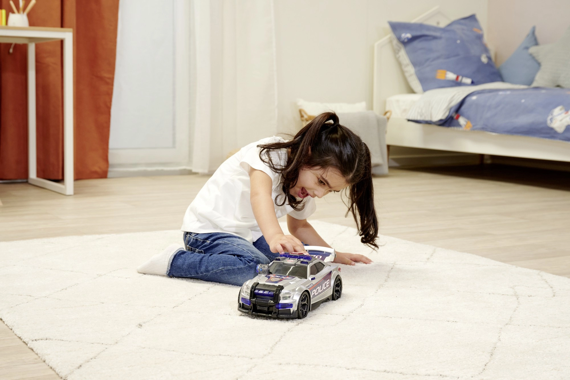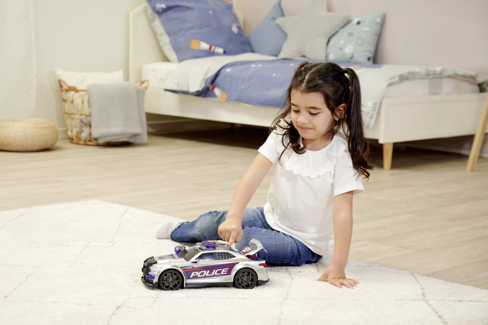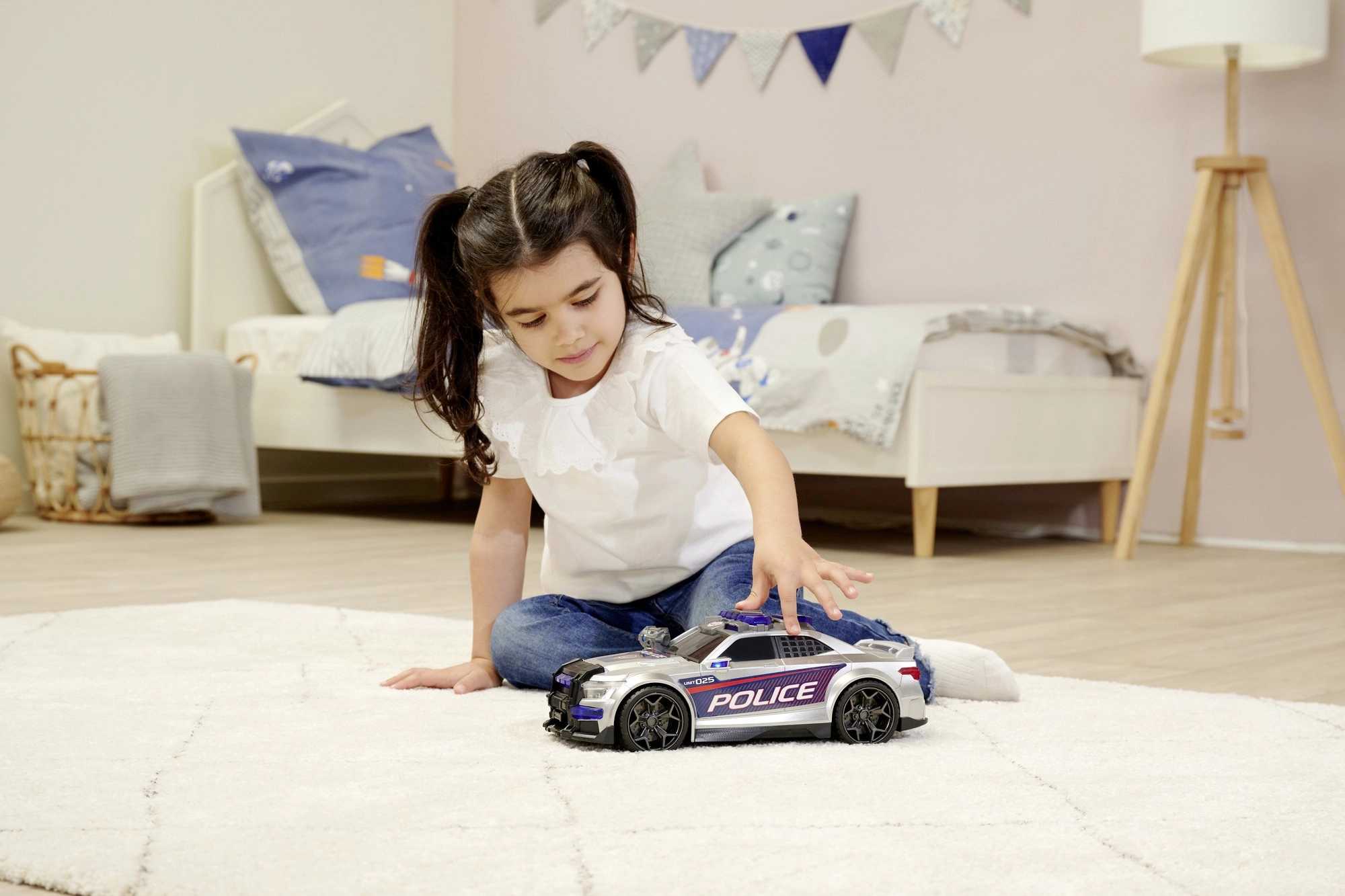 En appuyant sur le bouton situé sur le toit, les lumières bleues et rouges s’allument et les sirènes se déclenchent, soulignant l’atmosphère d’action d’une intervention policière.