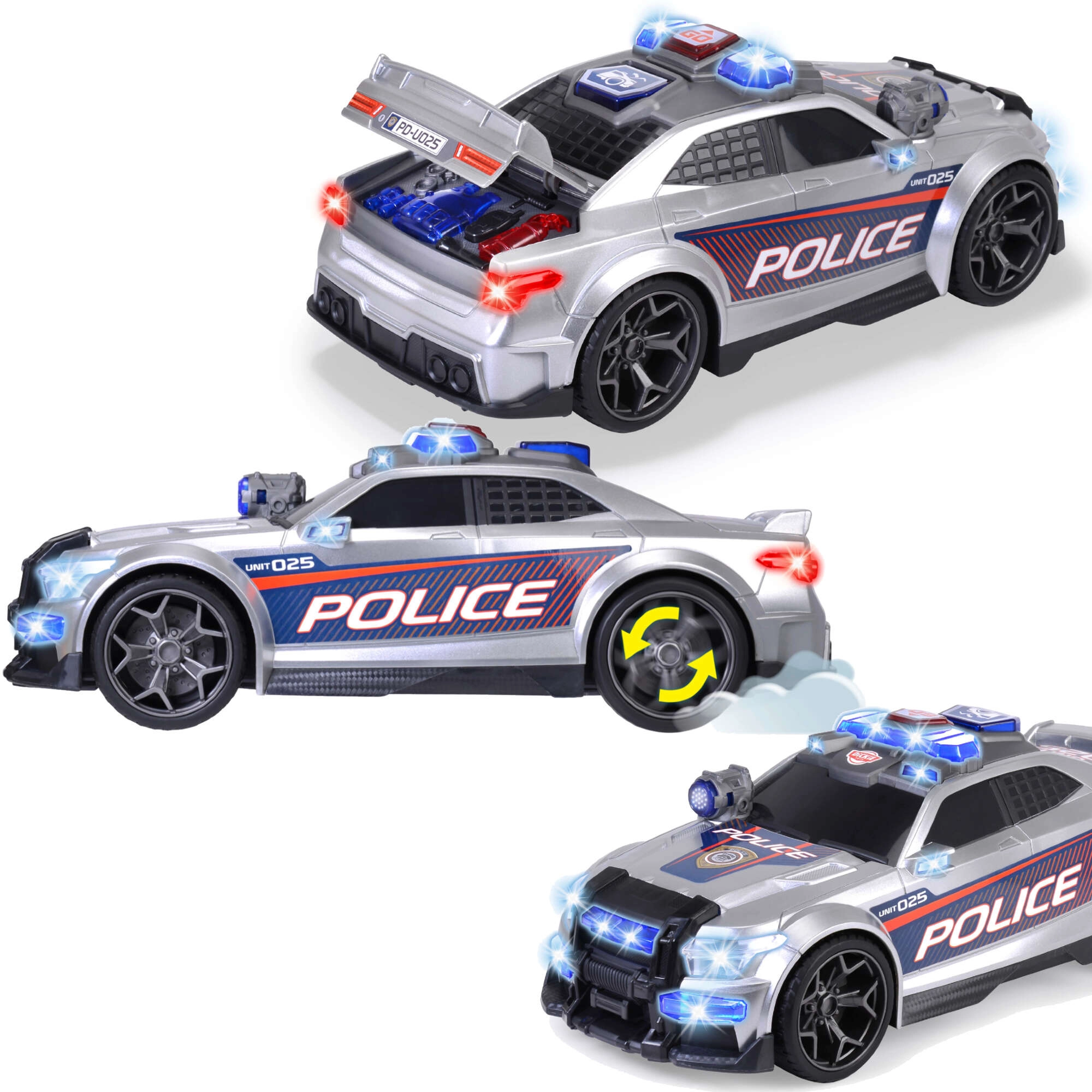 - Effets réalistes : lumières bleues et rouges, sirènes, bouton d’activation sur le toit.