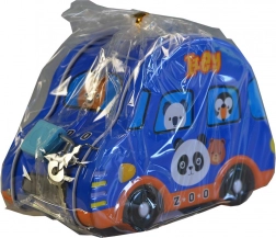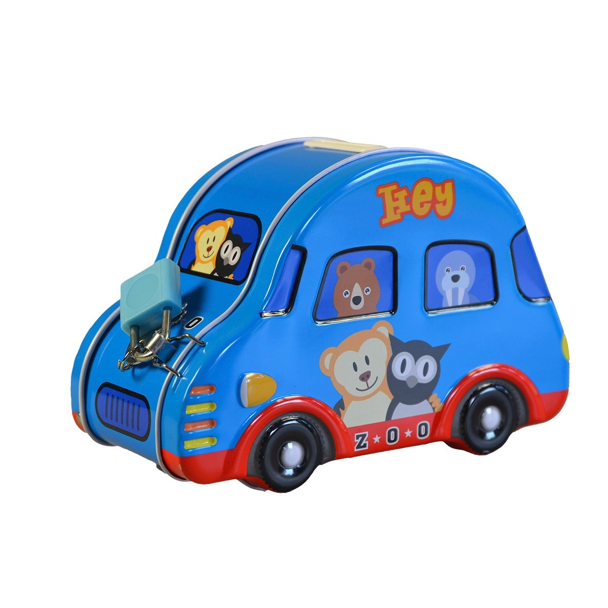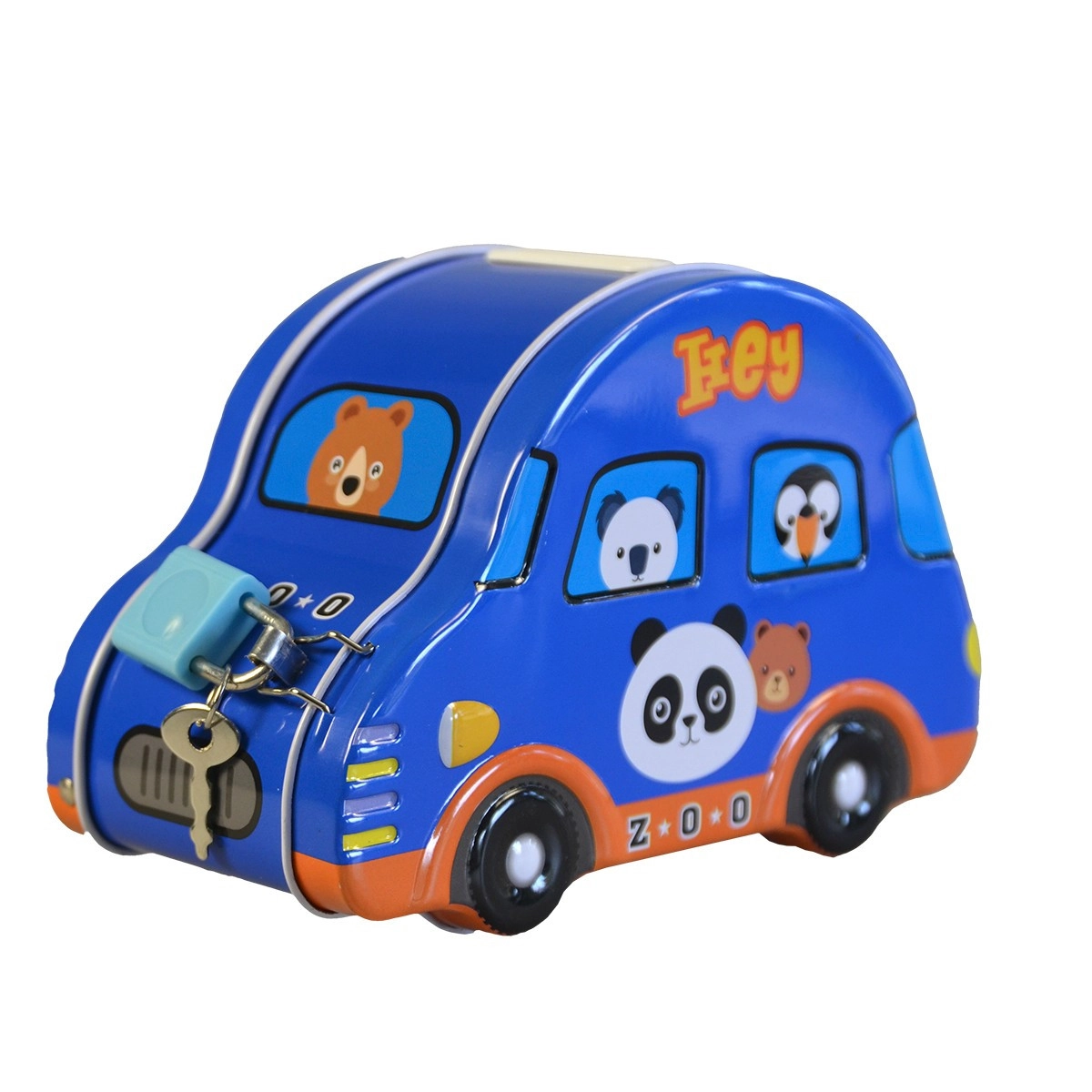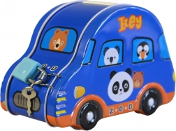 Cette tirelire pour enfants en forme de petite voiture combine design ludique et sécurité pratique. La fabrication en métal est résistante et les impressions colorées avec des animaux attirent l’œil dès le premier regard. Sur le dessus se trouve une fente pour insérer les pièces, à l’arrière ou à l’avant un petit cadenas avec clés pour sécuriser les économies.