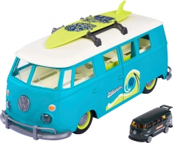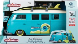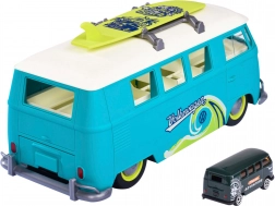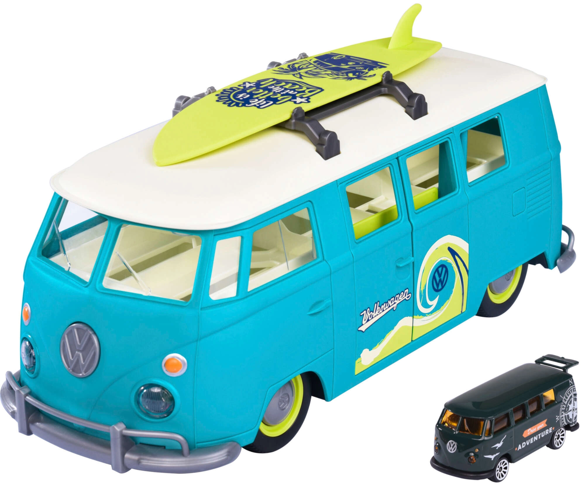 Le grand Volkswagen T1 interactif de la marque MAJORETTE séduit par sa fabrication précise et les détails authentiques du légendaire camper. Le porte-charges en forme de fourgon, dans une finition bleu-vert avec des éléments crème, s’ouvre en une mallette de jeu pratique avec des places de stationnement pour la voiture incluse. Le bouton avant en forme de logo VW active des lumières vives.