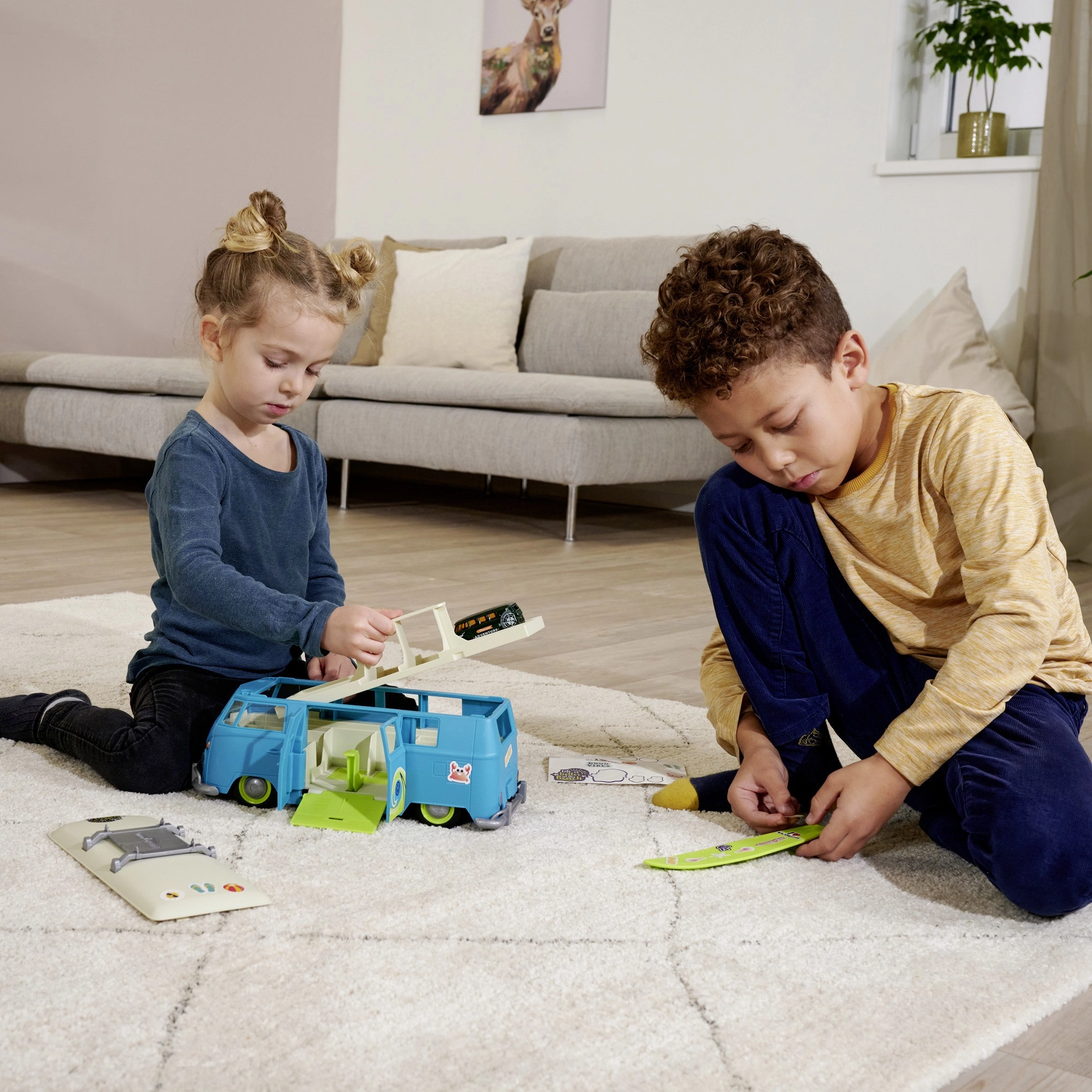 Le toit est amovible, le porte-bagages accueille une planche de surf détachable et l’arrière comporte un hayon basculant avec un espace « moteur ». La structure en plastique résistant convient à un jeu quotidien et développe la motricité fine ainsi que l’imagination des enfants dès 3 ans.