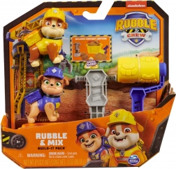 Rubble et Mix, en tenue de chantier jaune, motivent les enfants à jouer des histoires et à vivre des aventures communes sur le chantier.