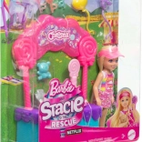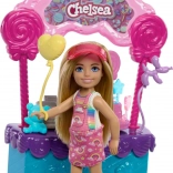 Le stand regorge de détails colorés : colonnes roses ornées de sucettes, caisse, surface d’exposition et présentoir tournant pour gâteau. La poupée Chelsea porte une robe rose à motif arc-en-ciel et une casquette stylée, a des bras articulés et peut “tenir” certains accessoires. Grâce à ses dimensions compactes, le set est parfait à la maison comme en déplacement.